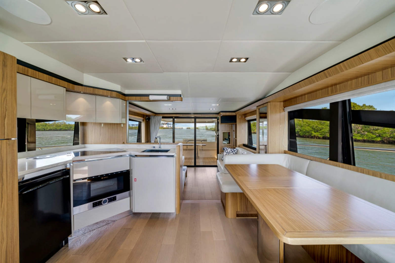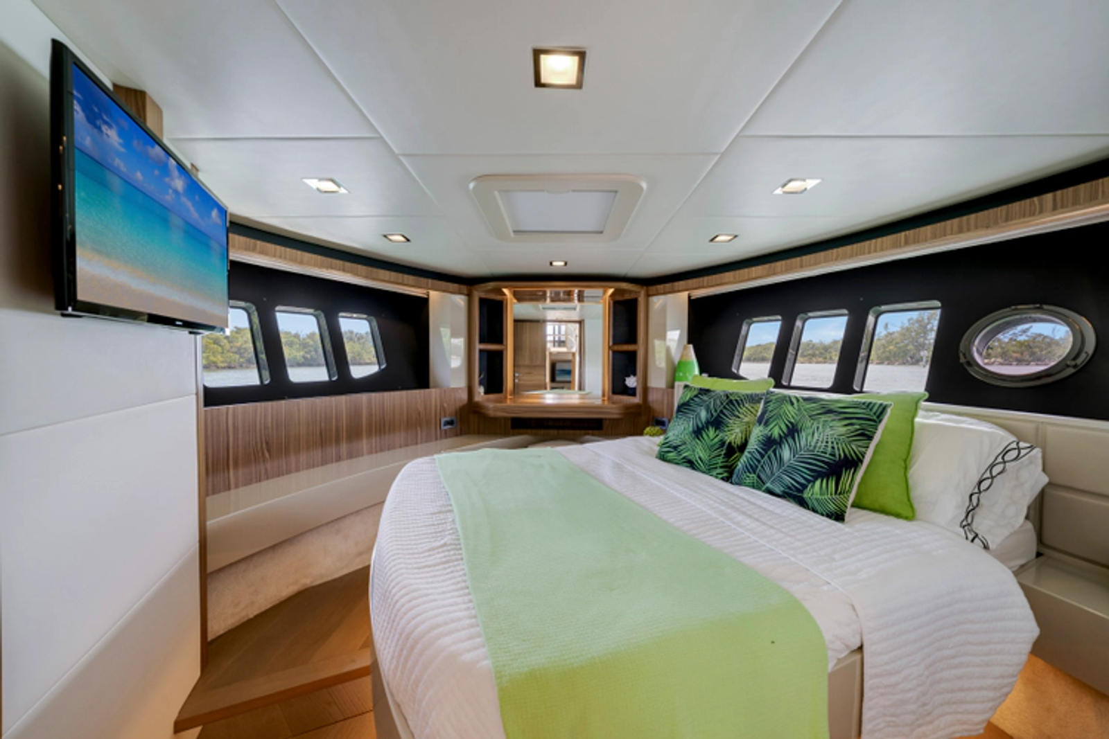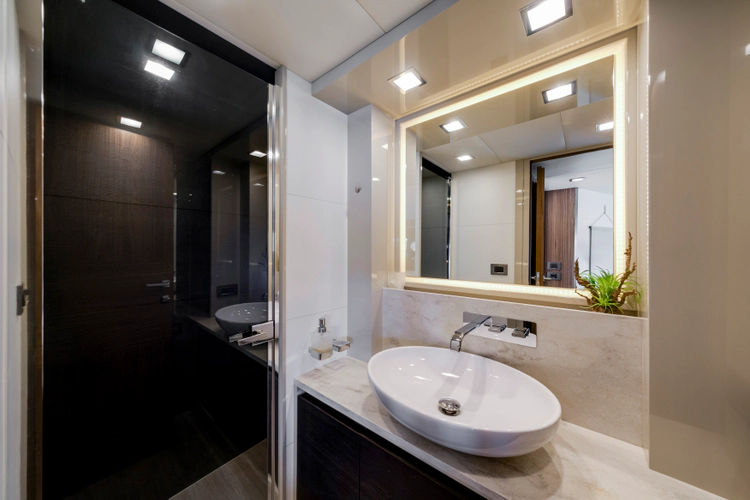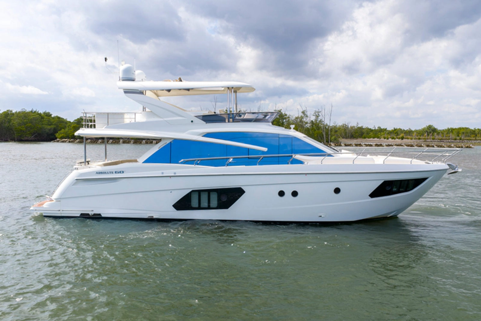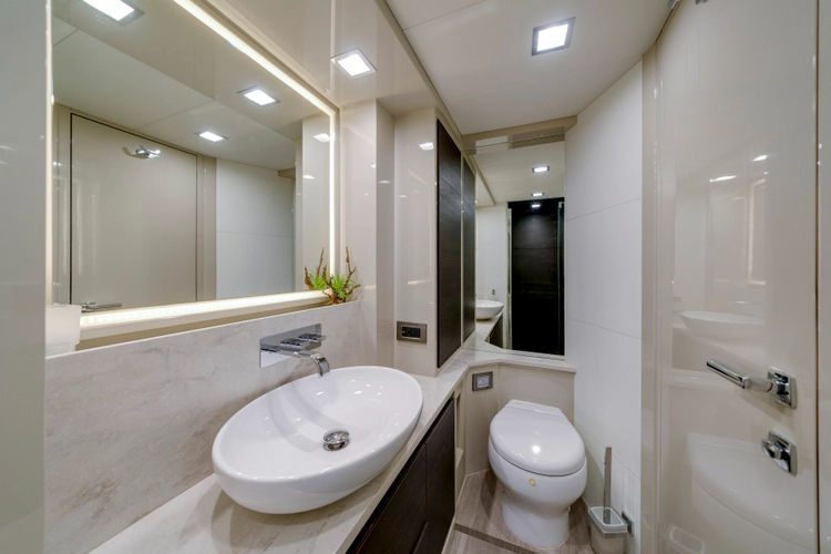 The layout features three spacious staterooms and three full heads, plus a private crew quarter with a double berth, providing excellent flexibility for owners who enjoy extended cruising or entertaining. The full-beam master stateroom is flooded with natural light thanks to Absolute’s signature panoramic hull windows, while the VIP and twin guest cabins ensure everyone on board enjoys premium accommodations.
