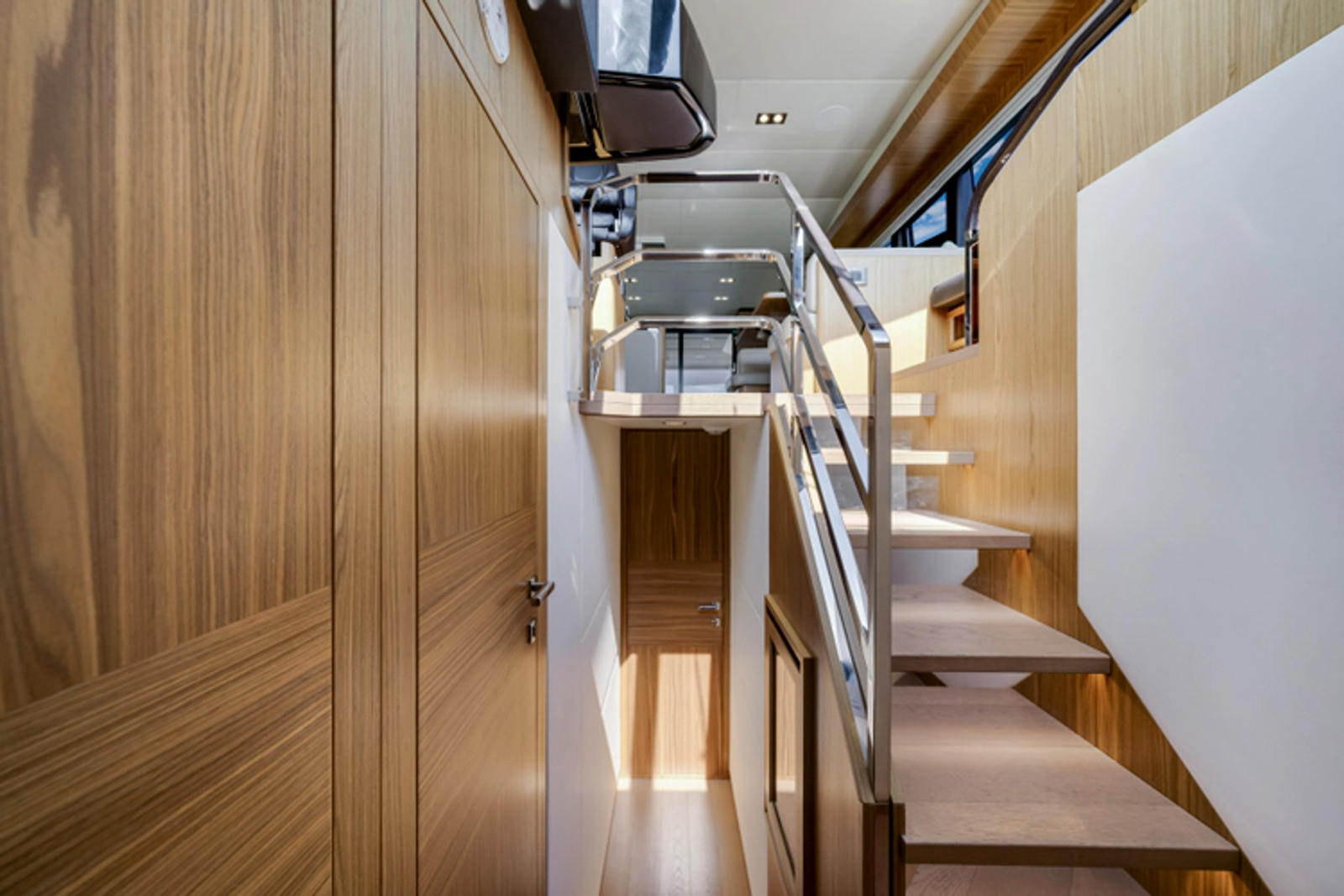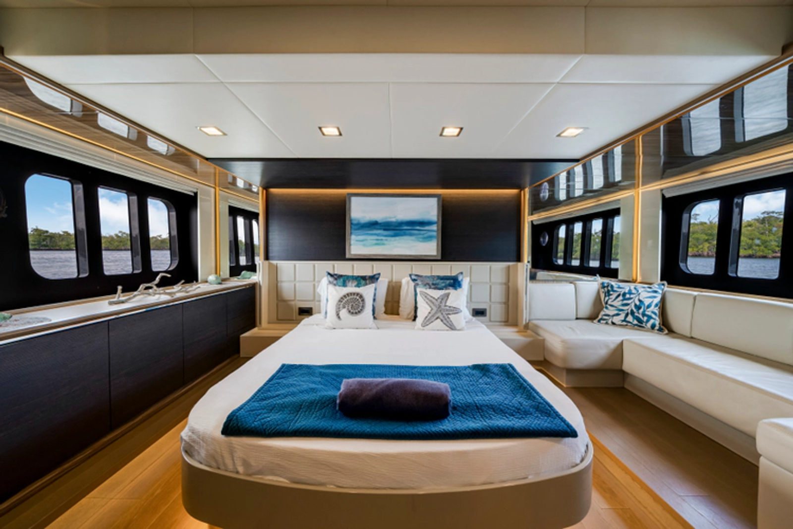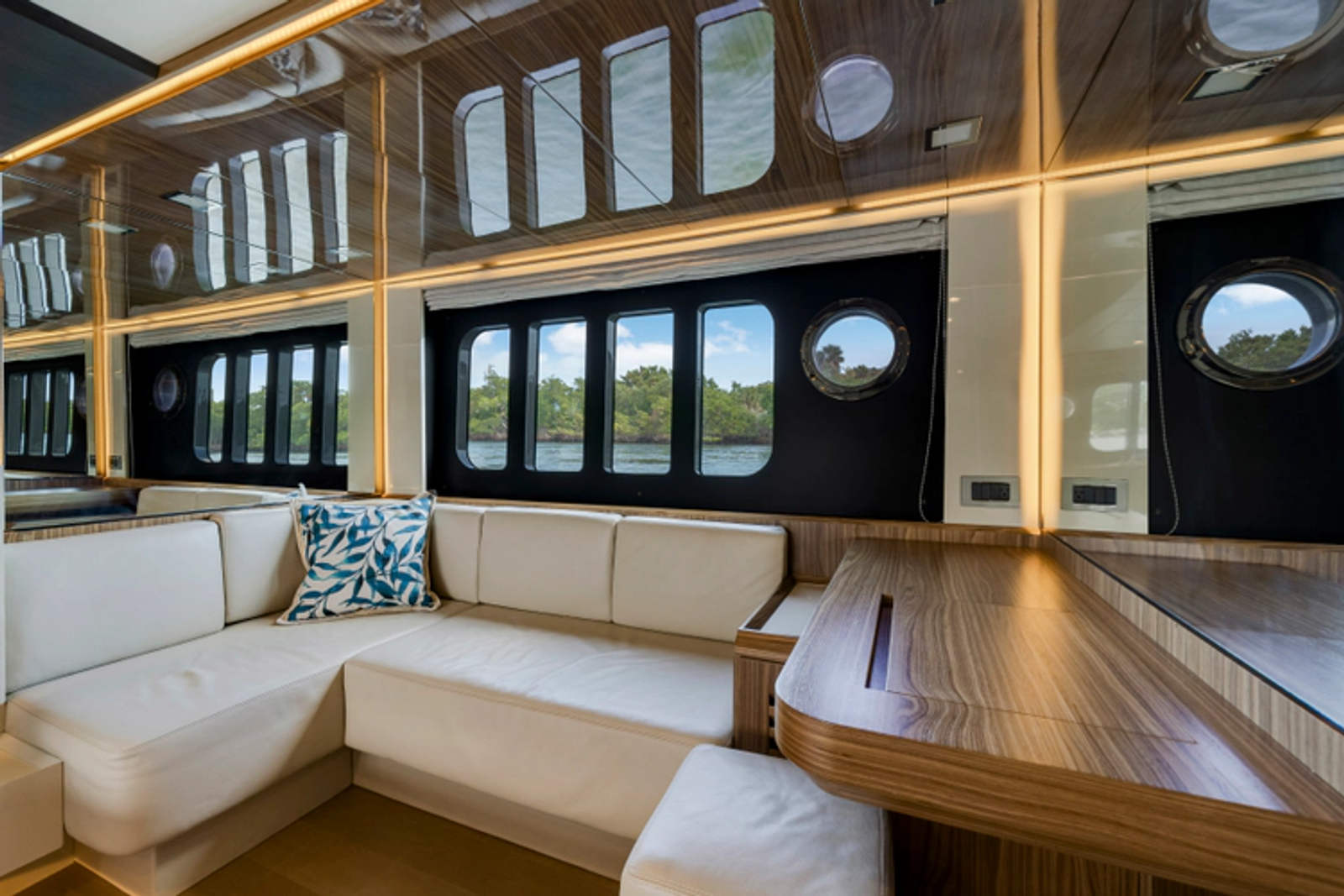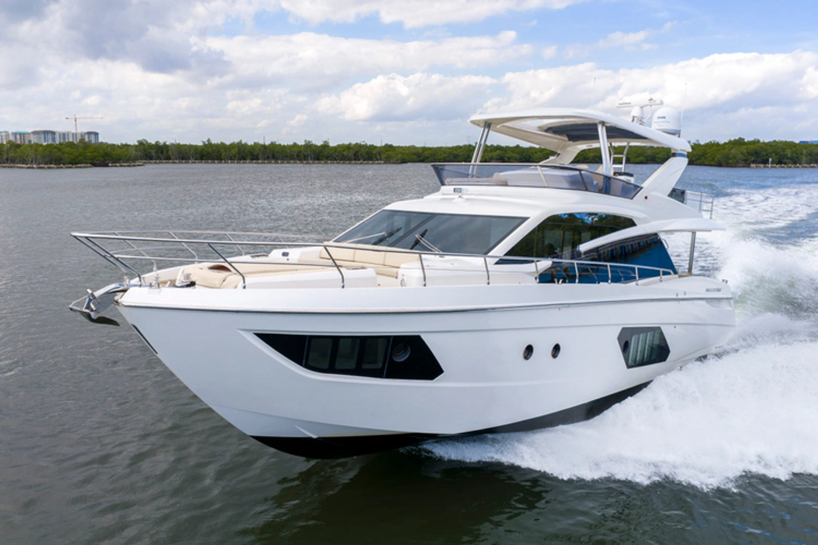 The layout features three spacious staterooms and three full heads, plus a private crew quarter with a double berth, providing excellent flexibility for owners who enjoy extended cruising or entertaining. The full-beam master stateroom is flooded with natural light thanks to Absolute’s signature panoramic hull windows, while the VIP and twin guest cabins ensure everyone on board enjoys premium accommodations.