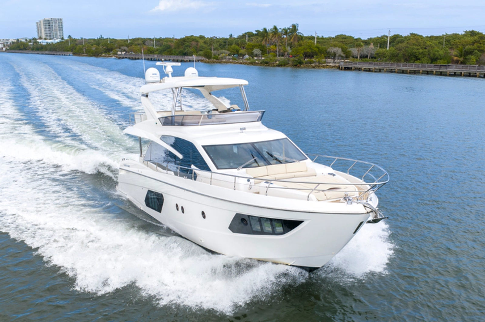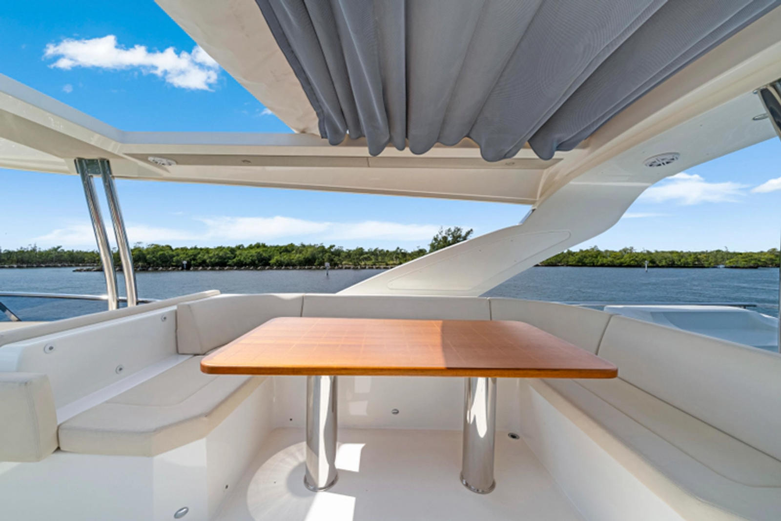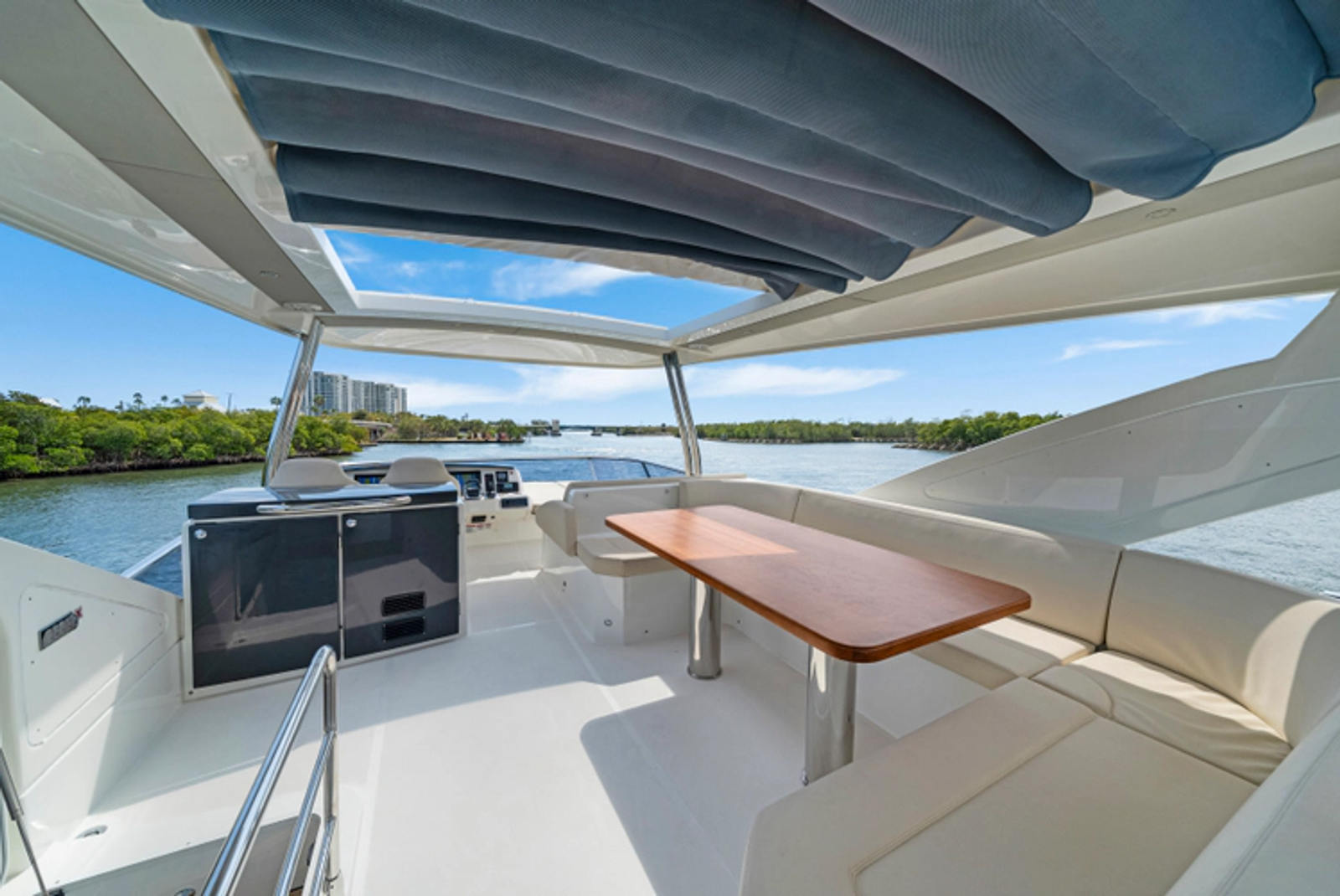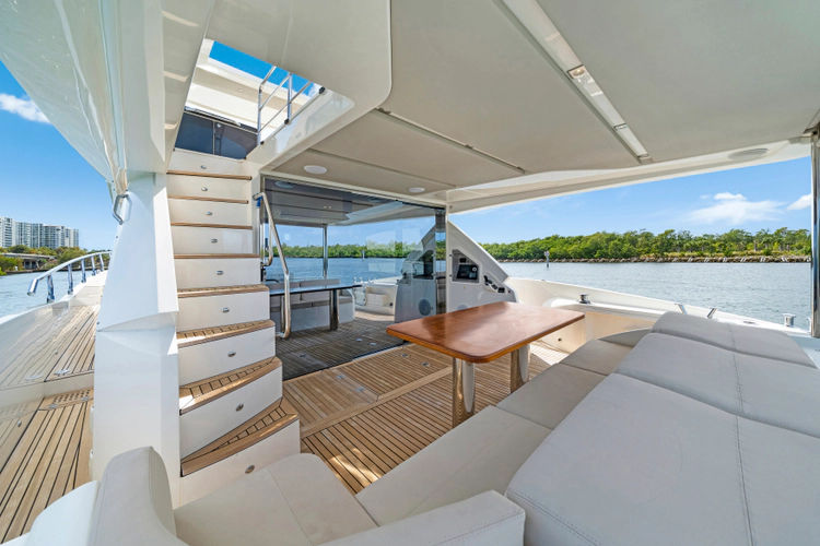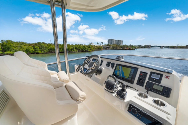 The flybridge is expansive and thoughtfully designed, offering ample seating, a wet bar, and commanding views from the upper helm—perfect for entertaining or relaxing at sunset. Below deck and in the main salon, you’ll find high-end finishes, contemporary styling, and large windows that create an open, airy feel throughout.