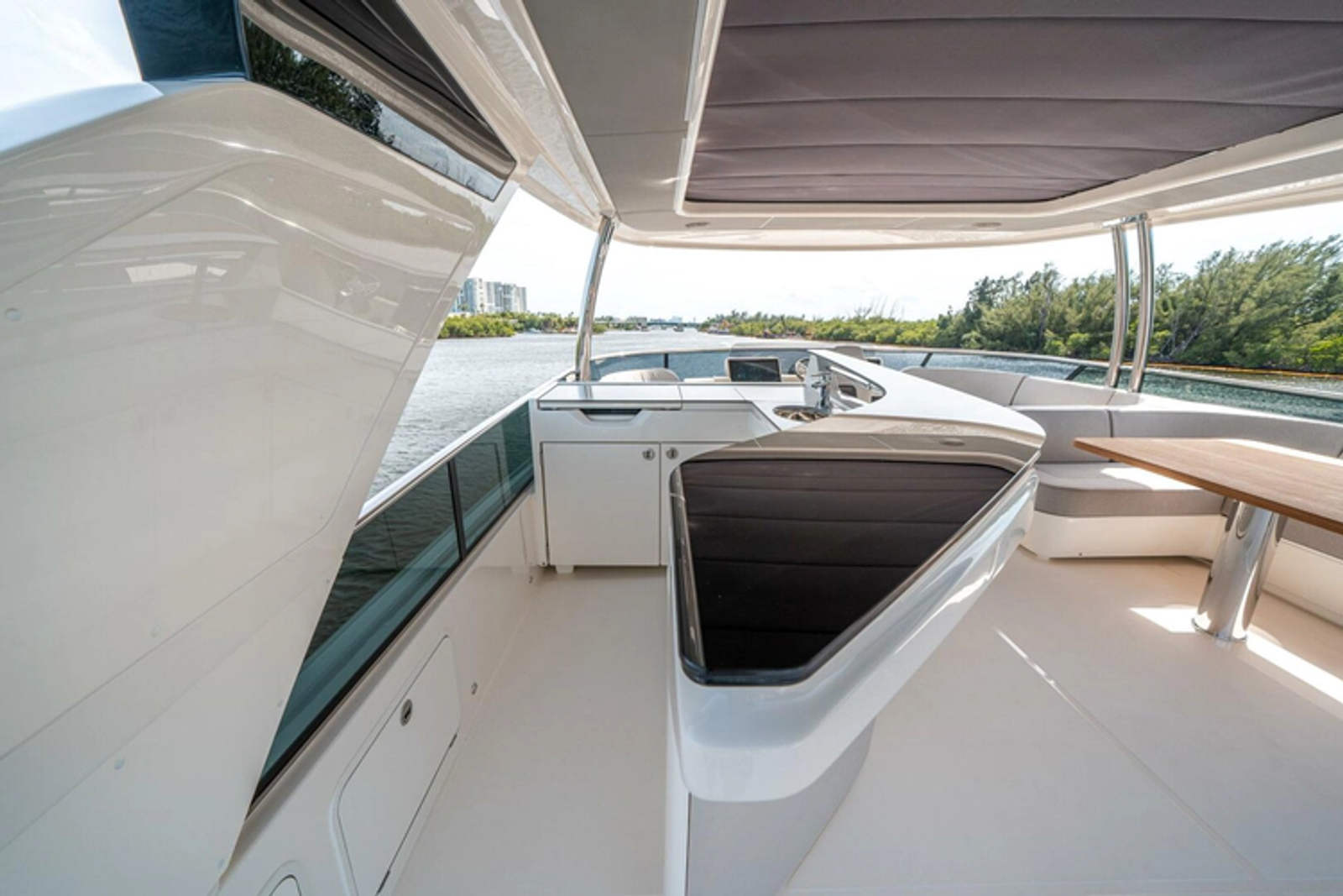 - Smoke tinted glass access door to the salon with two sliding doors and retractable glass window with electric high and low mechanism, that goes into a piece of furniture, usable from the galley and the cockpit, with Dekton with Calacatta marble nuances countertop.
