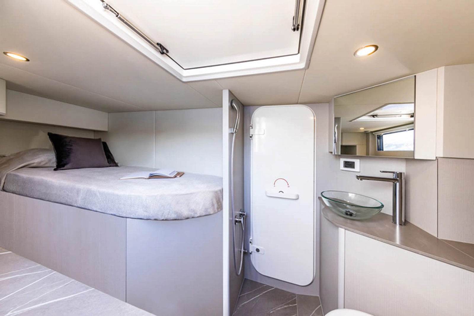 - Fourth aft cabin with bathroom (WC, basin and shower), accessible from the aft platform, instead of the aft storage compartment (bathroom in aft storage not available)