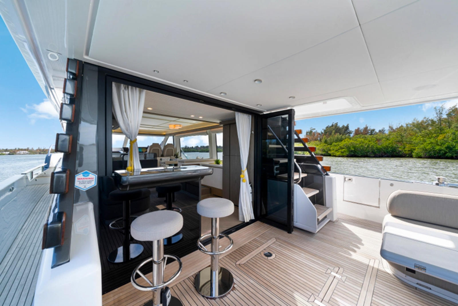 Fantastic cockpit area with added ice maker and a large table for alfresco dining.