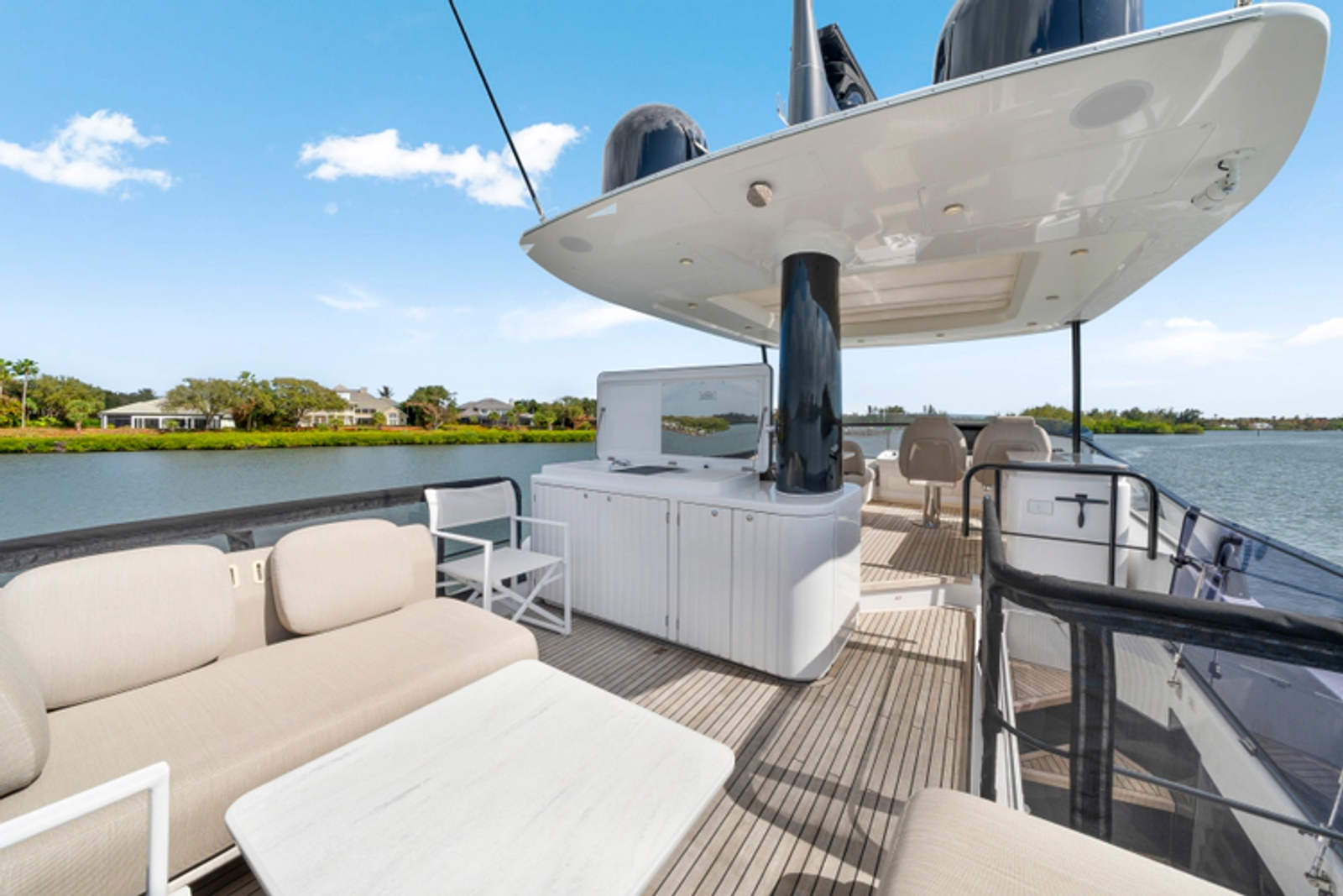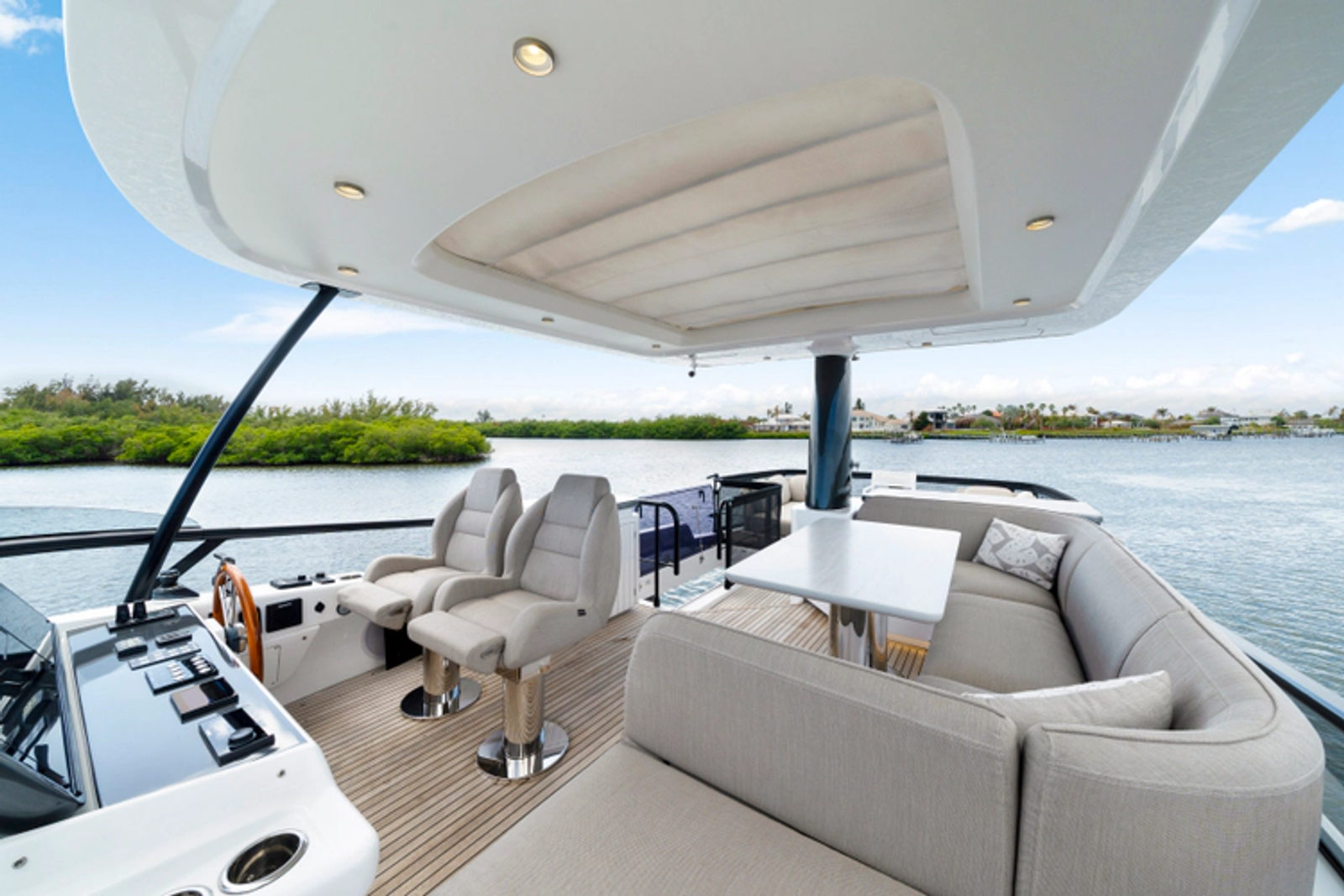 Shades all around - all windows and cockpit have side mesh shades. The bow and aft flybridge also have carbon fiber poles and sun shade sails.