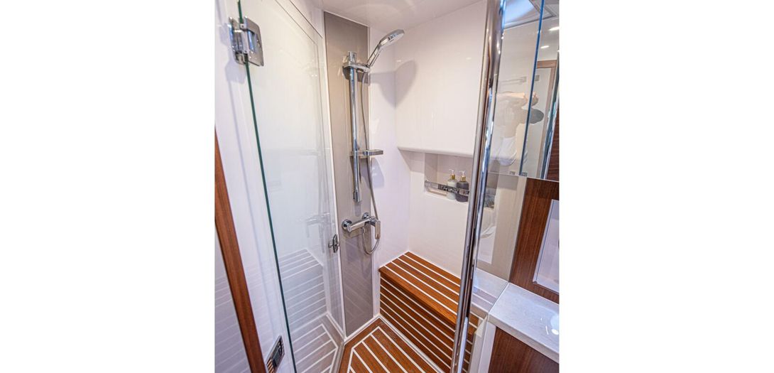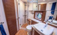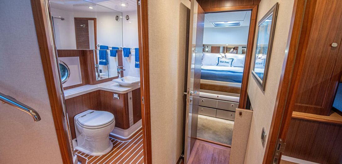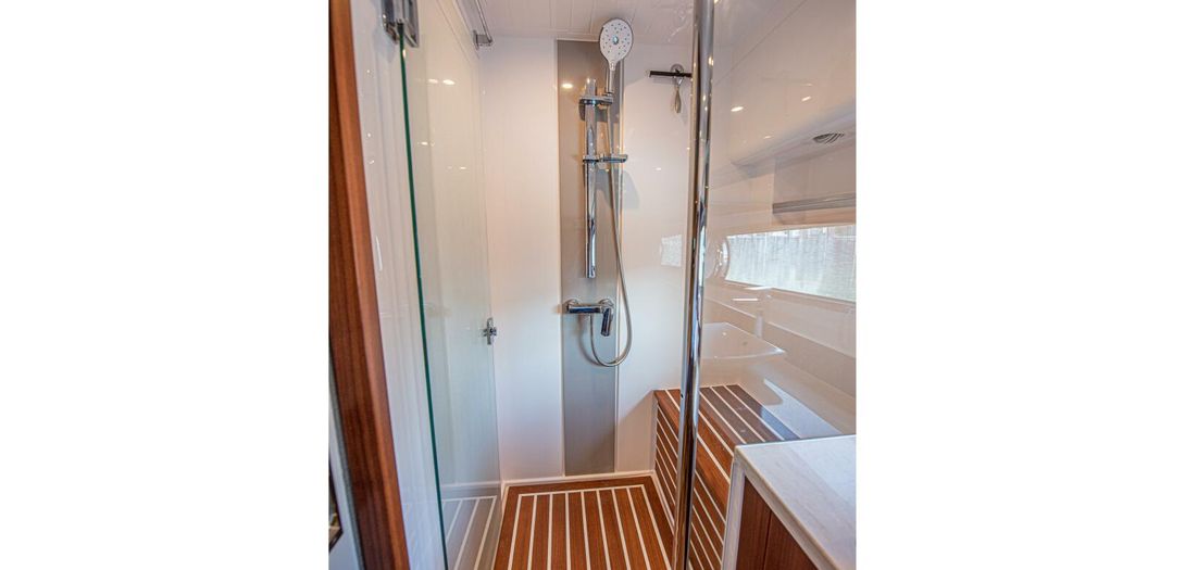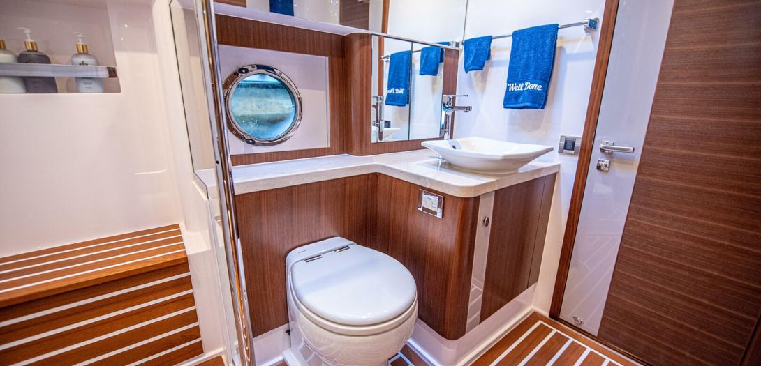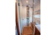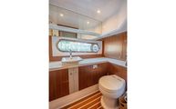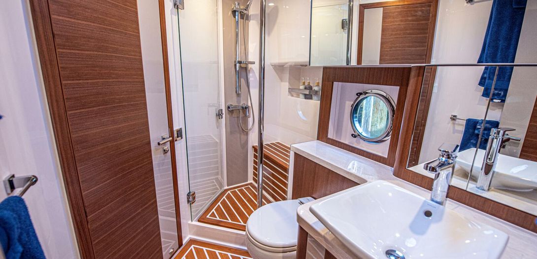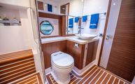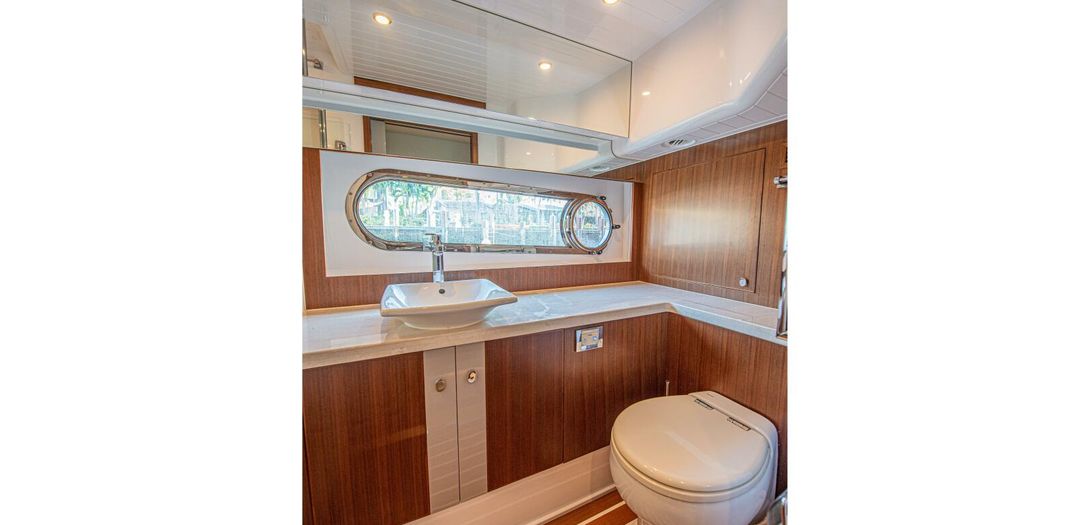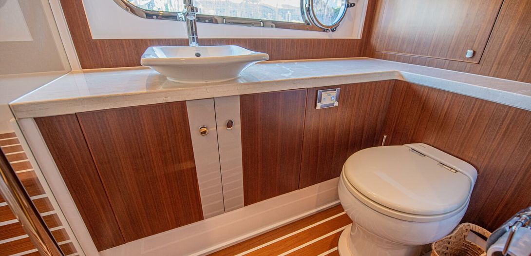 The day head has corridor access as well as ensuite access from the VIP stateroom. Just like the master, the floorplan and size of the head is very impressive. The shower is once again massive and eliminates any cramped or uncomfortable feeling often found on showers in boats of this size. Another large countertop, faux teak and holly floor, and porcelain, basin-style sink round out a head that is as equally accommodating as the master head.