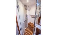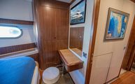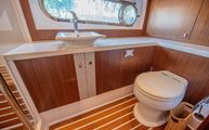 A very large master head sits to starboard, with one of the largest showers in class and usually only found on a considerably larger boat. Plenty of corian countertop space, a vessel style porcelain sink, lots of medicine cabinet storage all combine to create a very large and comfortable head, more in keeping with a bathroom at home than a head on a fifty-four foot boat. The hardwood flooring has faux holly inserts to once again give the classic feel of a Downeast style boat, but with a modern twist that is much more durable than a traditional teak and holly floor.