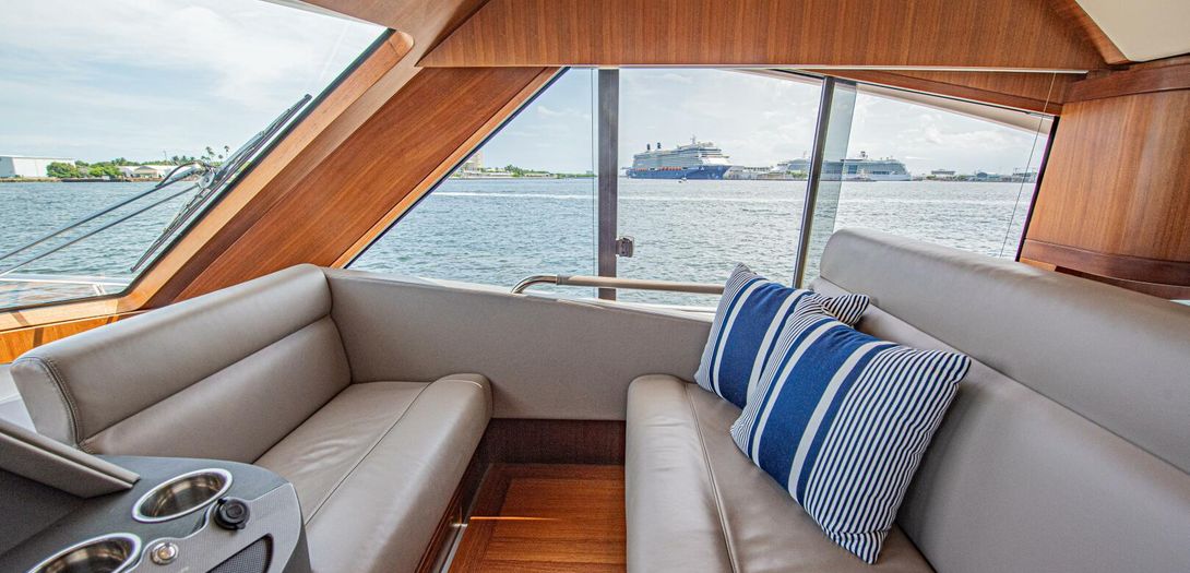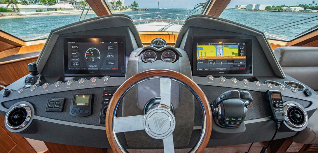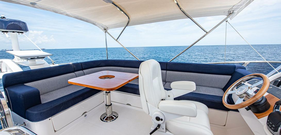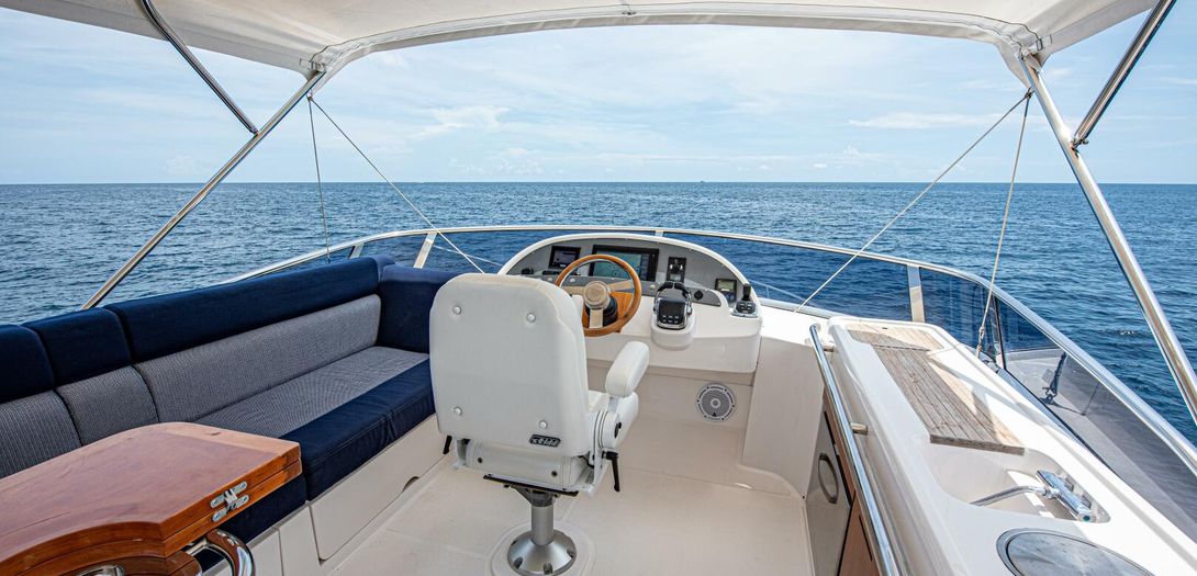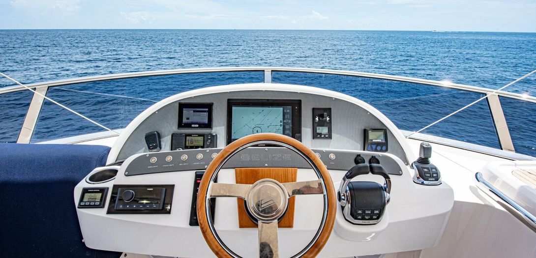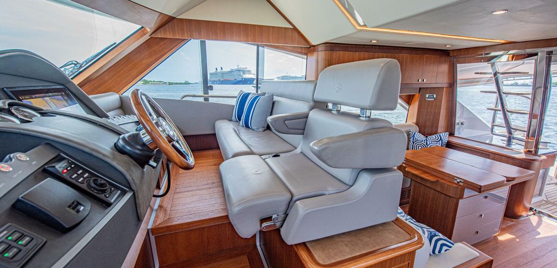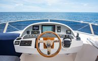 The bridge is accessed through stairs built into the starboard side cockpit console. Regarded as one of the sturdiest, most comfortable, and most adjustable chairs in yachting, a Stidd captains seat is centerline. A woodgrain steering wheel and accent dash panel keep in tune with the ageless style of Belize. Fully redundant, the flybridge helm features all the same equipment as the lower helm: IPS joystick, Volvo binnacles, chain counter, bow thruster control, Garmin chartplotter, CZone display, Garmin VHF, Garmin Grid controller, and upgraded Fusion Apollo stereo.
