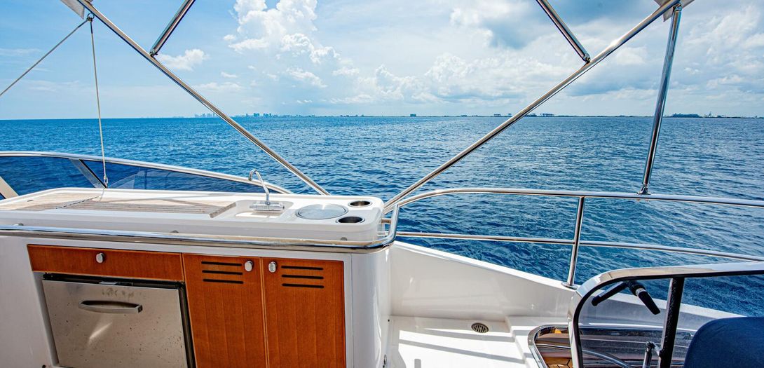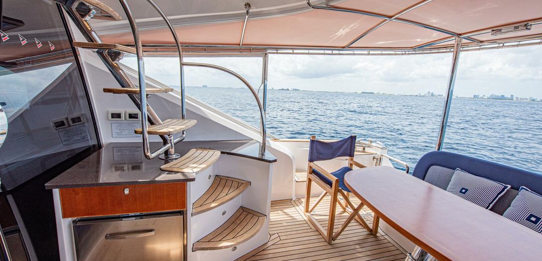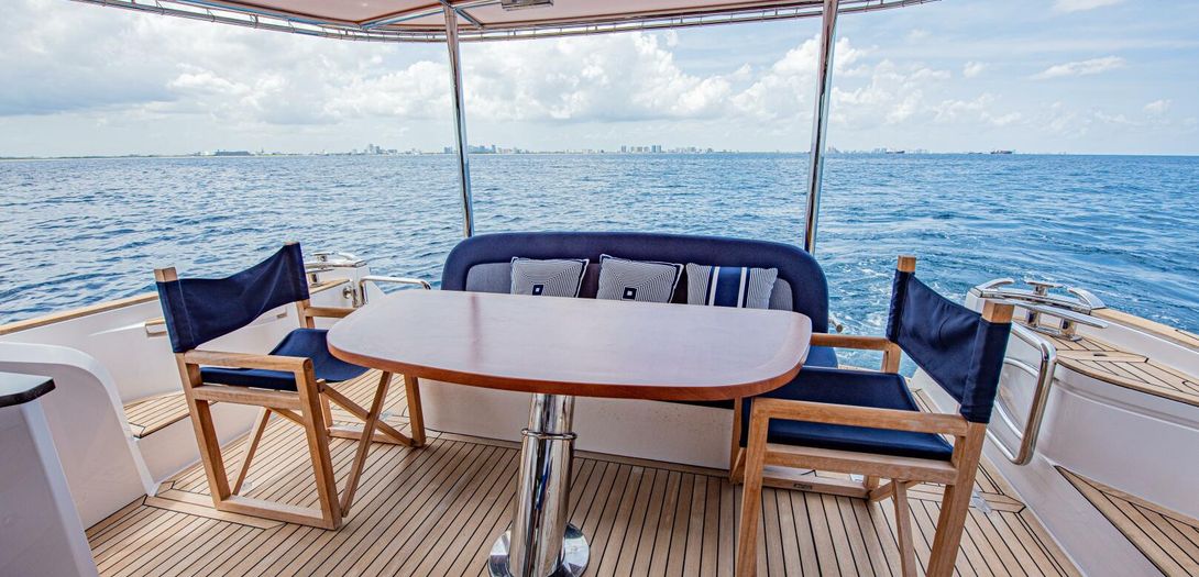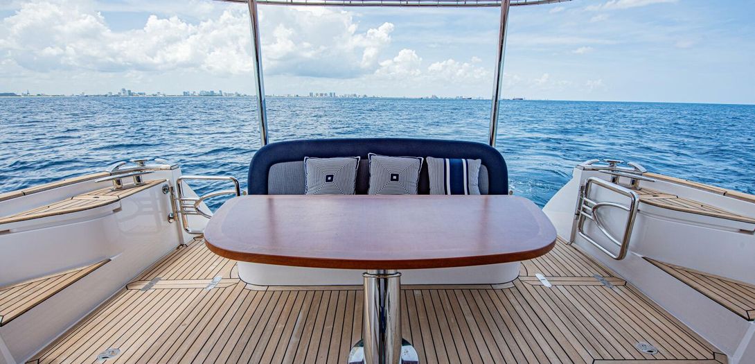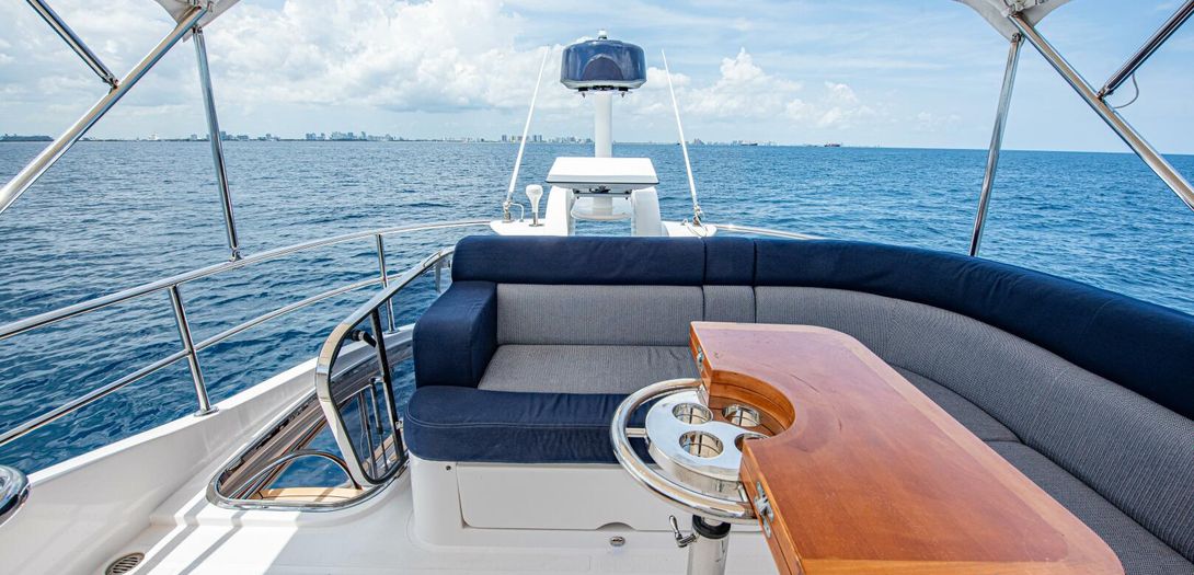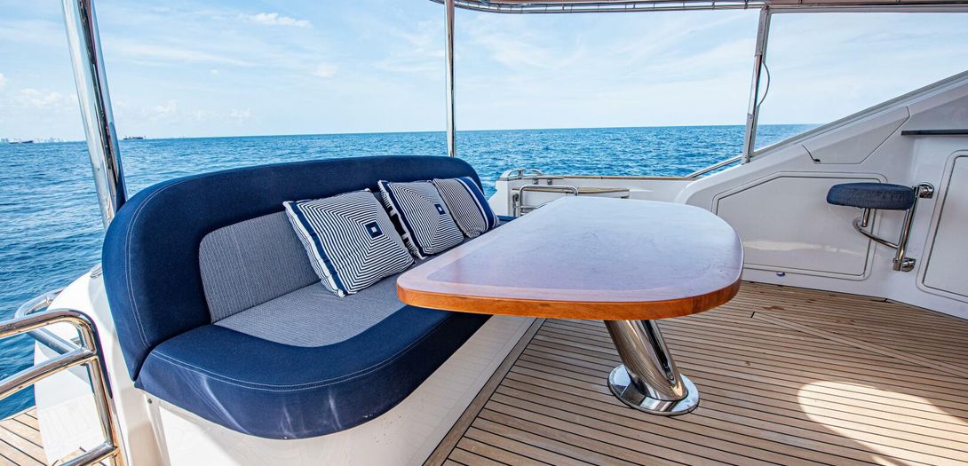 The bridge is accessed through stairs built into the starboard side cockpit console. Regarded as one of the sturdiest, most comfortable, and most adjustable chairs in yachting, a Stidd captains seat is centerline. A woodgrain steering wheel and accent dash panel keep in tune with the ageless style of Belize. Fully redundant, the flybridge helm features all the same equipment as the lower helm: IPS joystick, Volvo binnacles, chain counter, bow thruster control, Garmin chartplotter, CZone display, Garmin VHF, Garmin Grid controller, and upgraded Fusion Apollo stereo.