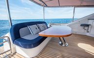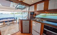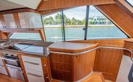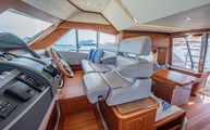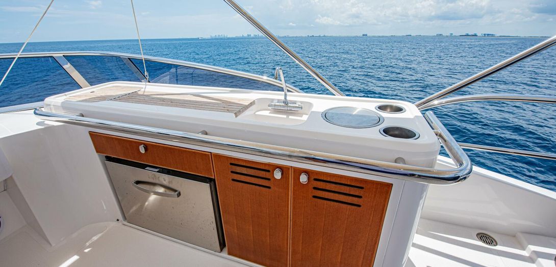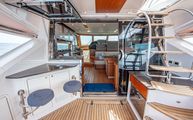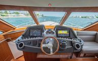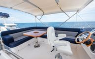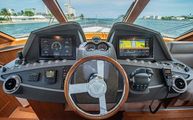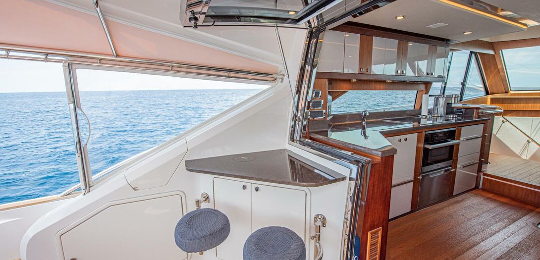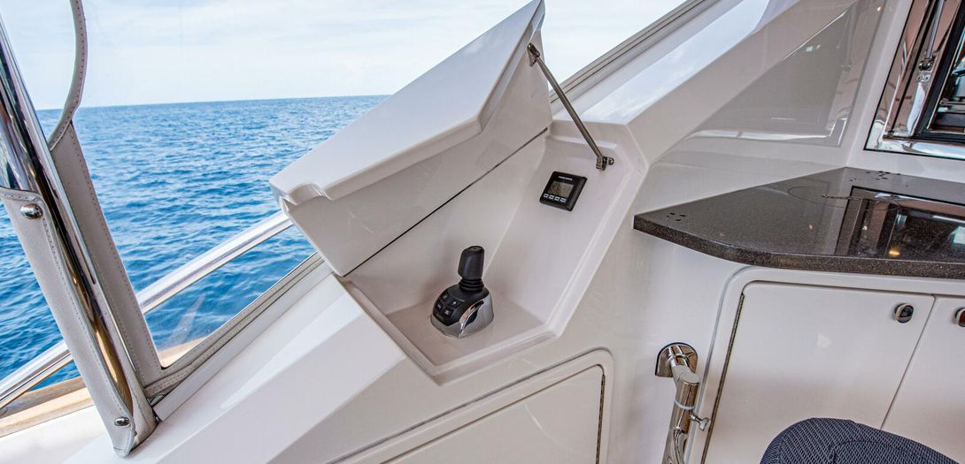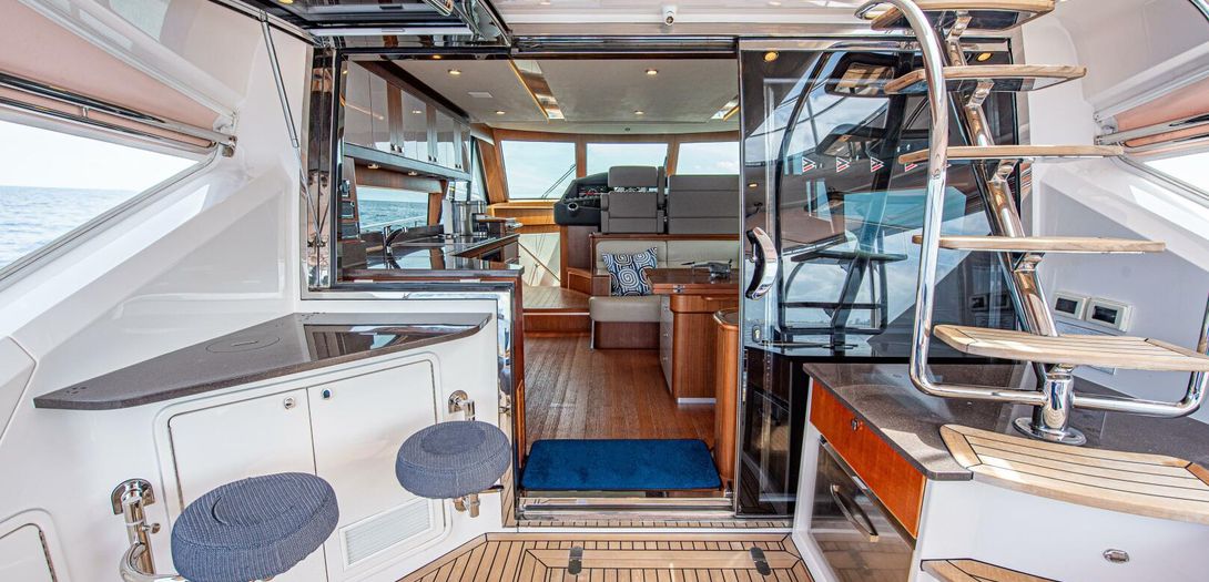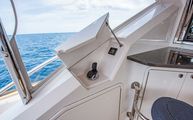 The forward port side of the cockpit has a countertop bar which sits just aft of the opening salon window, tying together the interior galley with the outdoor countertop and fold out bar stools. There is also a cockpit joystick with engine station, all cleverly concealed with a folding lid that is built in beautifully into the superstructure lines.