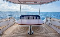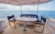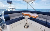 Side cockpit walkways are accessed on either side of a wide transom bench. Forward of the bench is an electric, high-low satin finished teak table. The owners have added Serena Lily teak directors chairs with custom covers to match the existing cockpit seating covers.