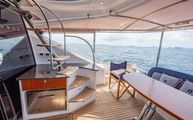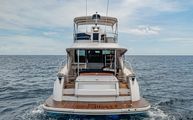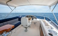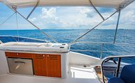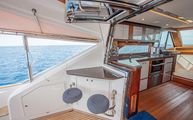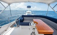 One of the most impressive areas of the boat is the expansive cockpit, covered full beam and full length by a fixed acrylic awning with stainless steel frame and supports. This makes the cockpit much more usable than most even in inclement weather. Each aft corner of the cockpit has large deck hatches which make accessing the pod area of the engine room considerably easier than some boats that require crawling over the engines to get to that area. Next to each of the pod access hatches, the beefy stainless steel hawse guide and stern cleats have a dedicated line locker for excess line running off the cleats.