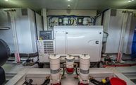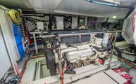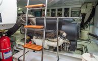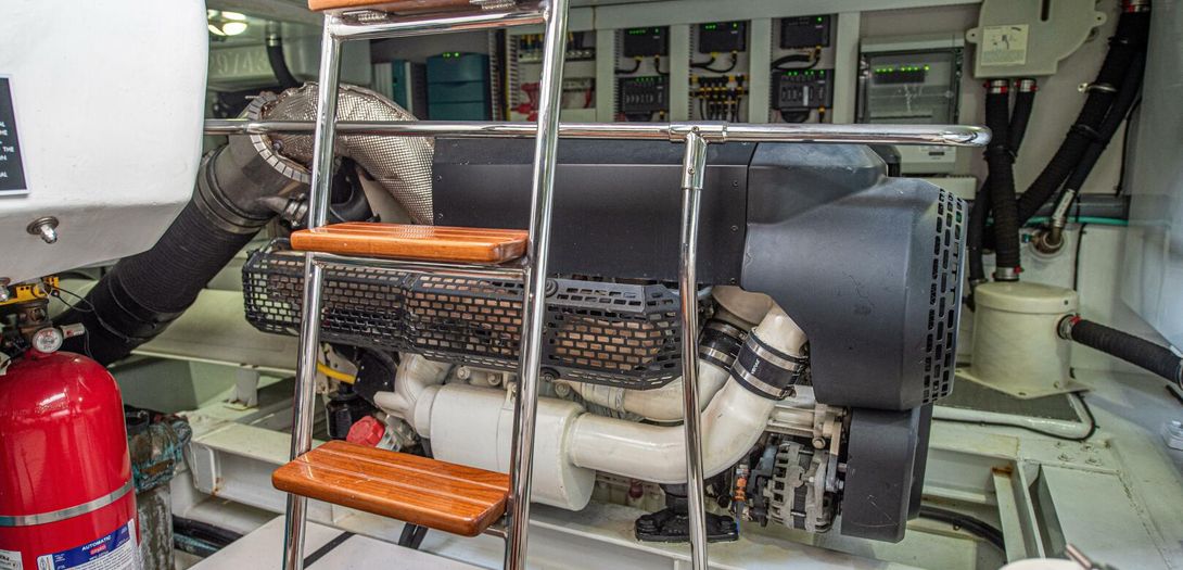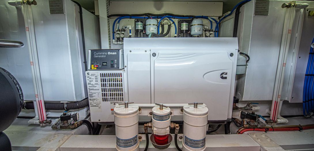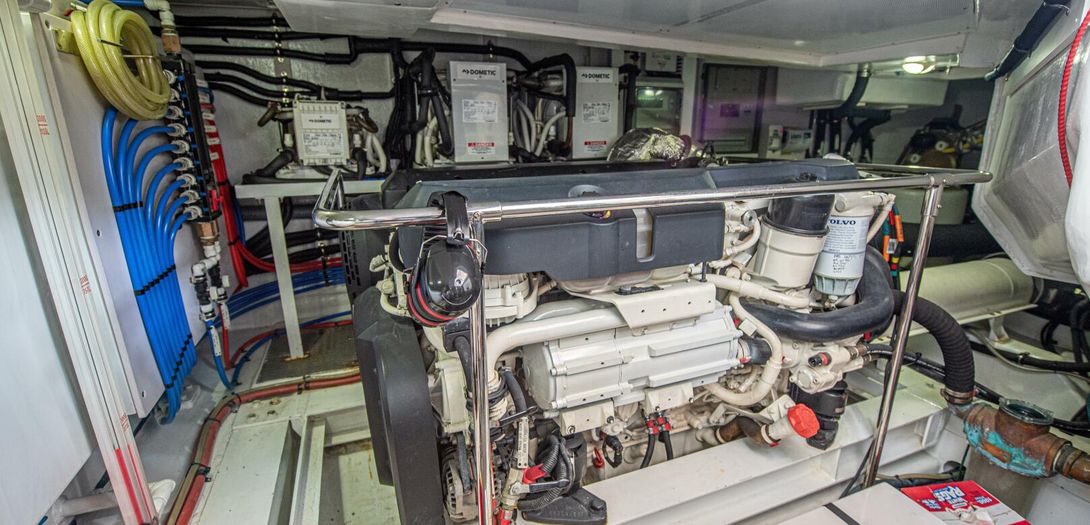 The engine room is incredibly well laid out, labeled, and serviceable for all equipment. Twin D8 Volvo Penta inboards power IPS 15 pods (IPS 800 package) which produce 600 horsepower each. The Cummins Onan generator is very easily accessed between the fuel tanks on the forward bulkhead.