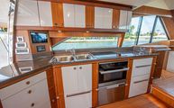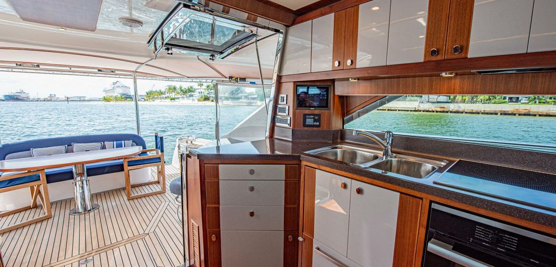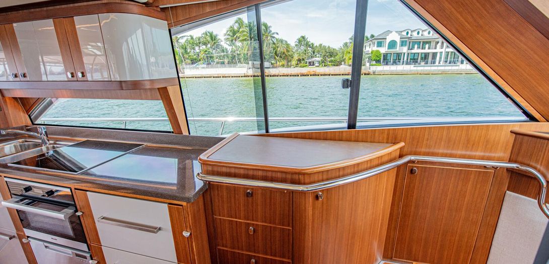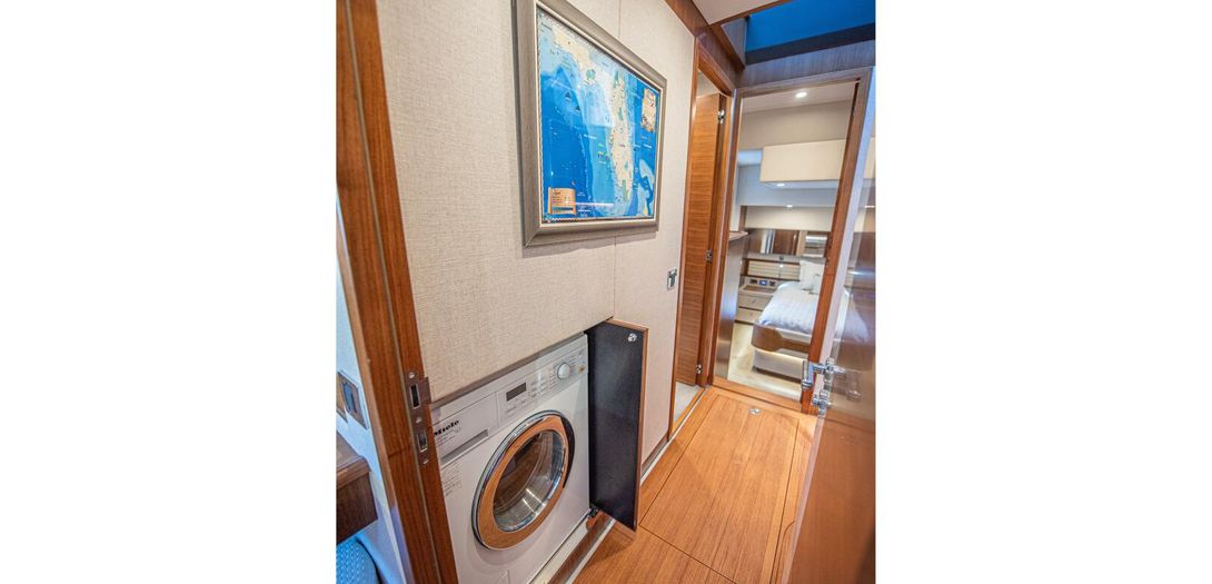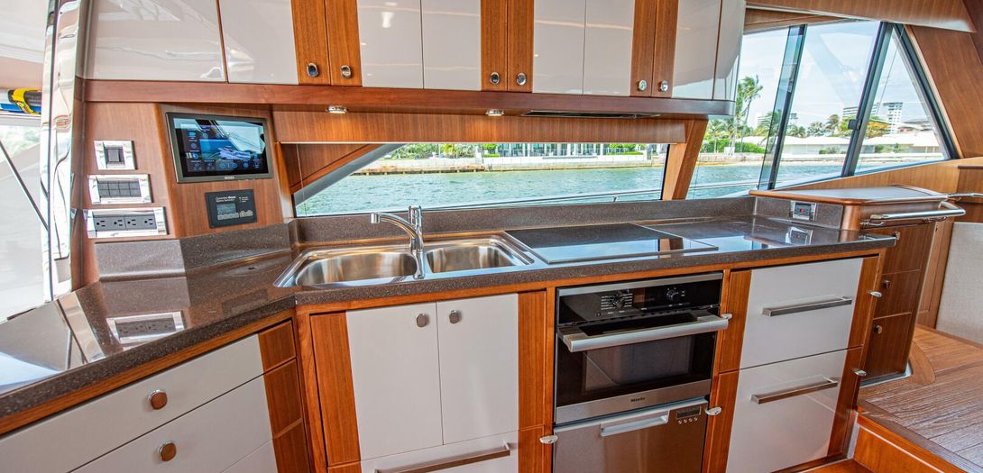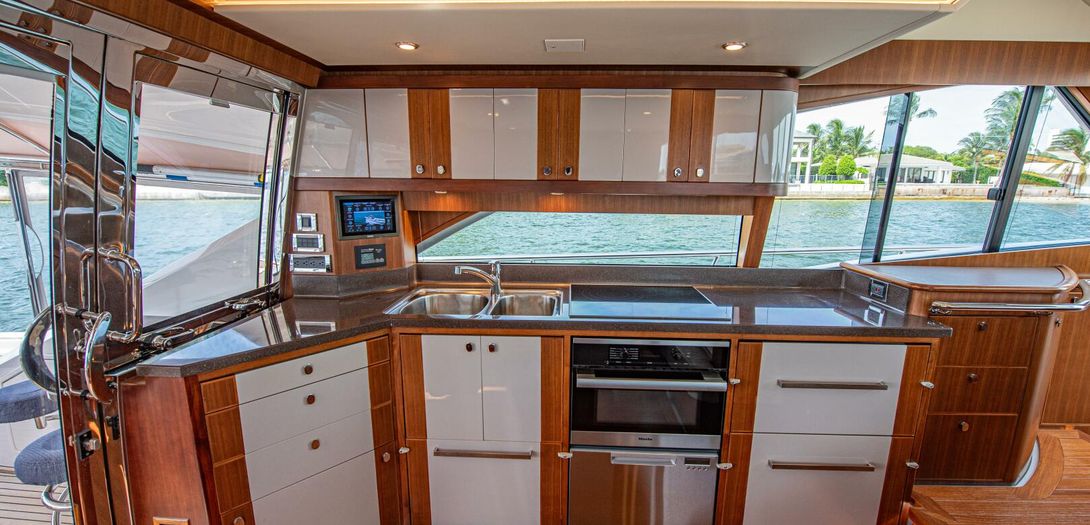 Portside is the galley. Beautiful satin finished cabinetry is partially sprayed in lacquer producing a great blend of modern and classic. A completely outfitted galley has a double basin stainless steel sink, Miele cooktop, Miele convection oven, drawer freezer and refrigerators, dishwasher, and plenty of storage. The galley houses one of the boats Czone displays. CZone is a digital switching system that controls all AC and DC powered circuits. Incredibly easy to use, the system has preset and programmable modes for Dock Unattended, Cruising, and Entertaining. With one push of the button, all desired circuits for each mode turn on and off. All electronics, all lighting, all air conditioning, and others can be turned on and off with one touch as well. To true and experienced boaters, this system is one of the best pieces of equipment onboard. Czone also has manual overrides for all circuits for added safety and redundancy.