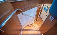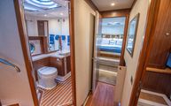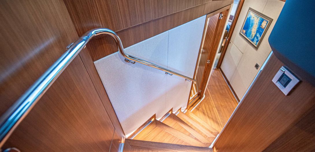 Below deck is accessed by extra wide steps on the port side of the salon. The steps, and all the hardwood flooring on the boat, are textured to avoid any slipping and eliminating the need for throw rugs to accomplish that job.