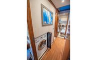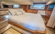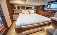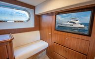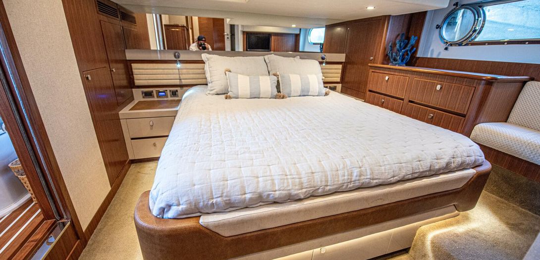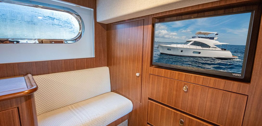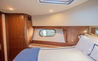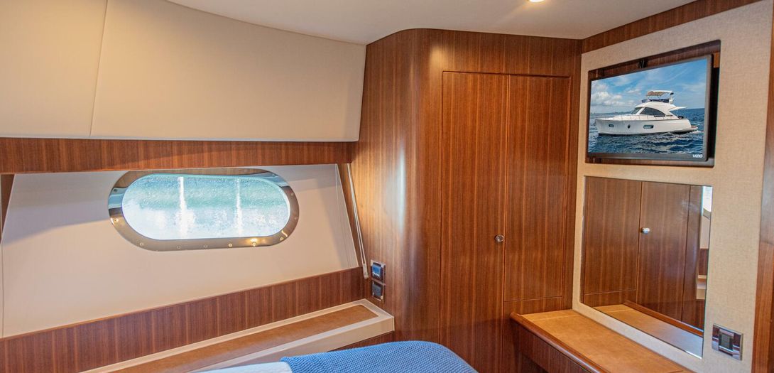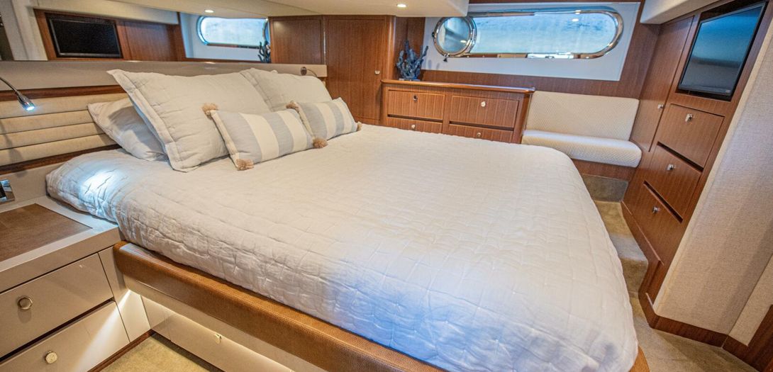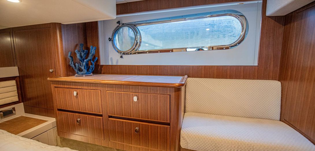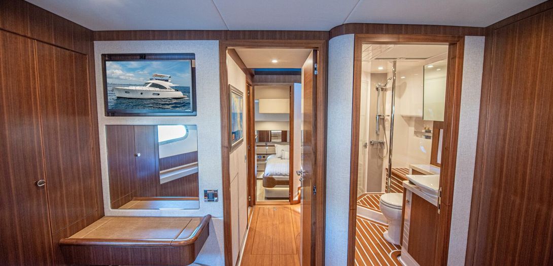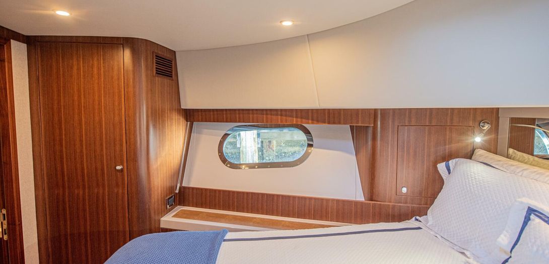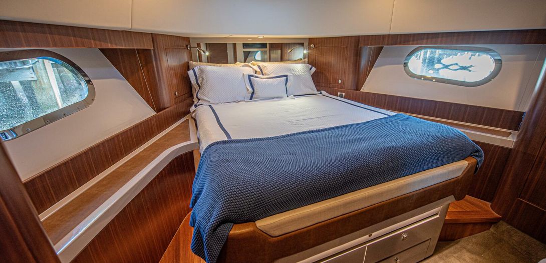 The full-beam master stateroom sits aft with a forward-facing, island-style queen bed. Decorated in a combination of American quarter walnut, ultra leather, lacquered cabinets, and a louvered fabric headboard, the stateroom is beautifully appointed. Wide side windows and opening portholes allow for natural light and ventilation. Plenty of in-wall and drawer storage make it easy to provision and store items for long periods aboard. A port side lounge is a nice area for owners to sit and relax in the privacy of their own stateroom. The wall mounted, upgraded Smart TV round out the stateroom to provide all the creature comforts of home.