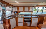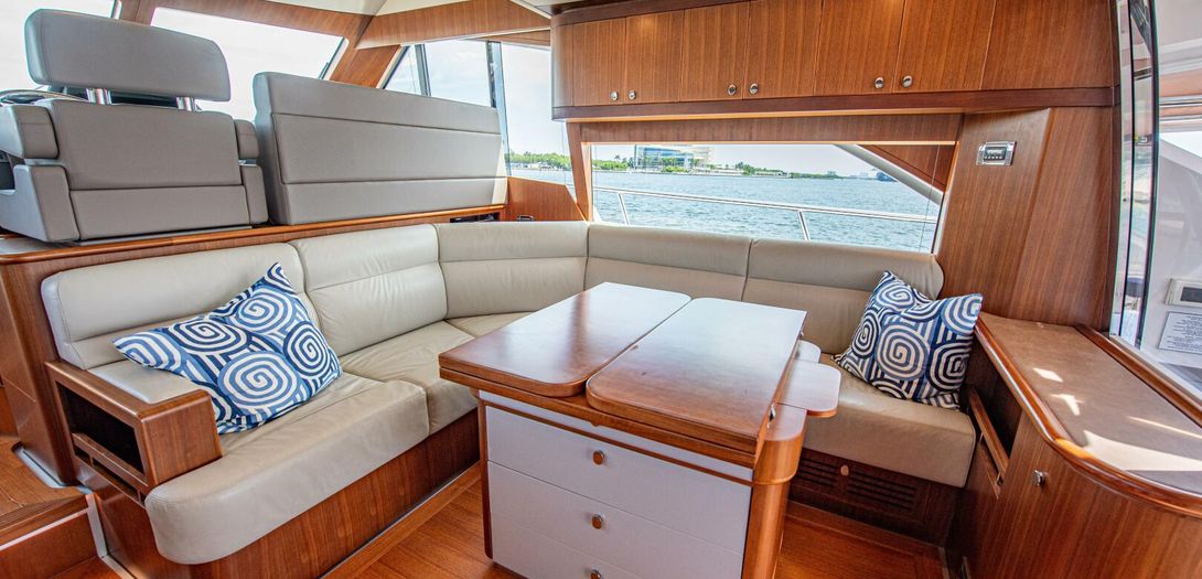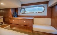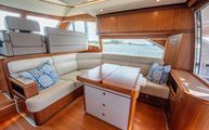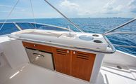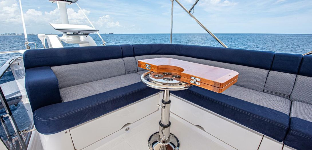Expansive L shaped seating on the bridge is upholstered in a classic pattern of navy trim and a patterned grey insert. Storage is beneath all bridge seating for easy access to life jackets, flares, or a life raft. A folding satin teak table is on the aft bridge which can telescope to any desired height. The bridge bimini has built in overhead lighting which can be white or full spectrum color changing. The starboard side of the bridge houses a wet bar complete with teak prepping station, sink, refrigerator, stainless covered trash chute, and storage. All of which combine to make the bridge a great place to entertain and leaving not much reason for guests to leave and go down below.