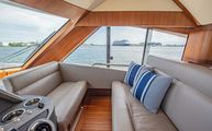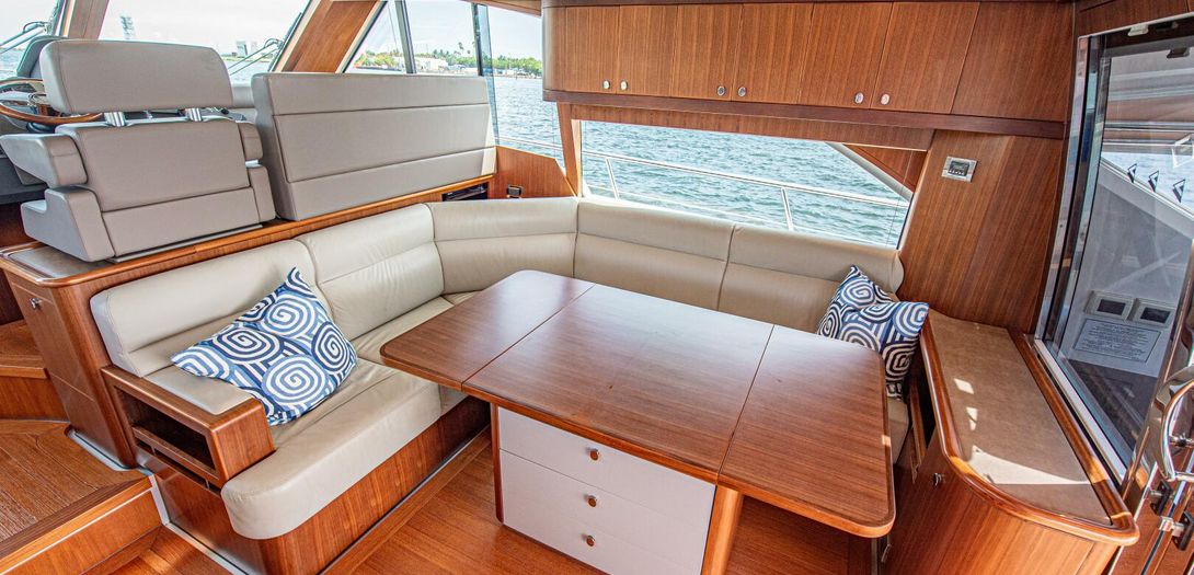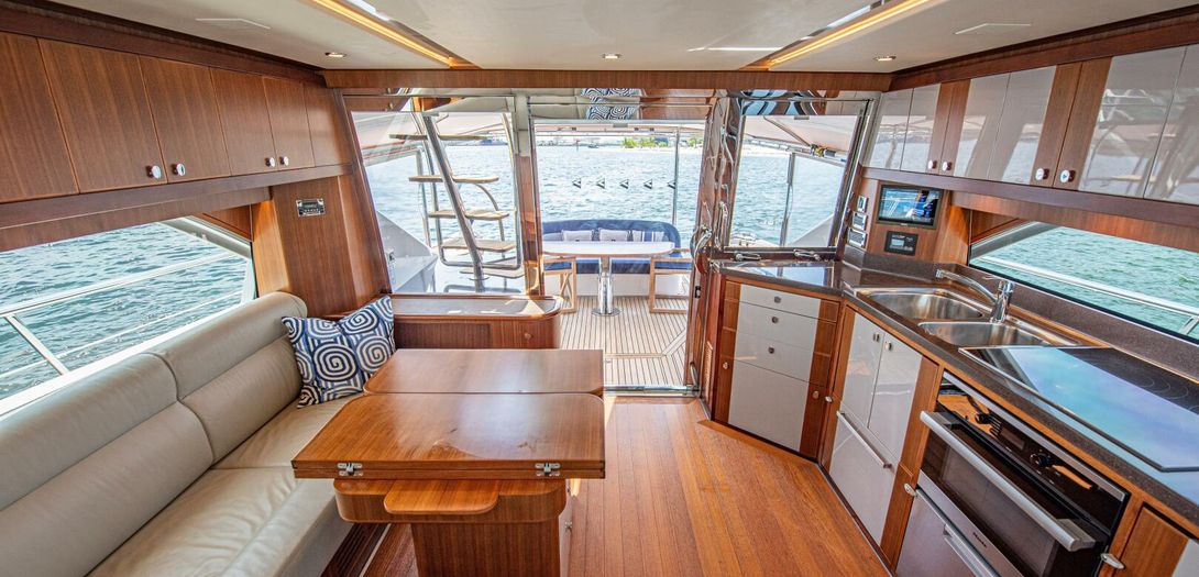 Like the bridge, the lower helm is also centerline and beautifully appointed with all desired electronic equipment for navigation as well as teak and ultraleather trim. Equipment includes dual Garmin chatplotters with full Volvo Penta Glass Cockpit integration, IPS joystick, chain counter, Garmin GRID control, Volvo tachometers, Volvo binnacles, Garmin VHF and adjustable wood grain steering wheel with large stainless steel spokes. Starboard of the helm is a double wide companion seat which gives the ability for two guests to sit facing forward while underway – rare to find in a boat of this size. Sliding helm windows on either side and an overhead hatch allow for plenty of air flow when desired. Beautiful American quarter walnut windshield supports serve as a great reminder of the Belize style and commitment to craftsmanship.