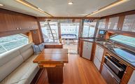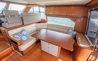 A large L shaped sofa sits starboard in the salon, with a folding table atop a console with cabinetry finish and storage drawers. For formal dining, leaflets fold out and chairs can be added to allow for dining for five or six people. A cleverly hidden high-low TV comes out of an Ultraleather covered console just aft of the sofa.