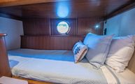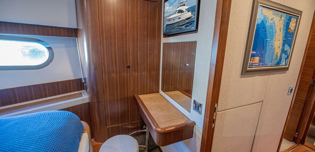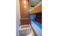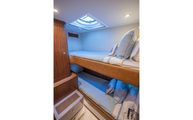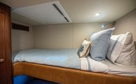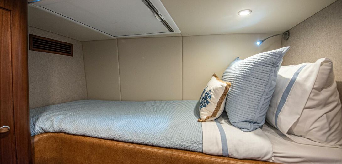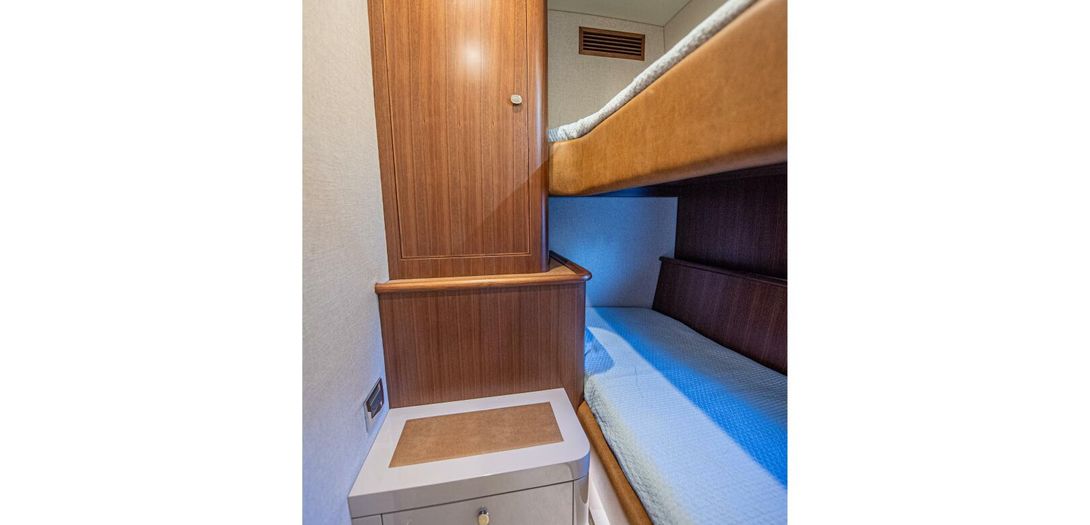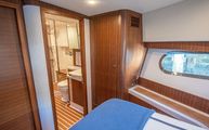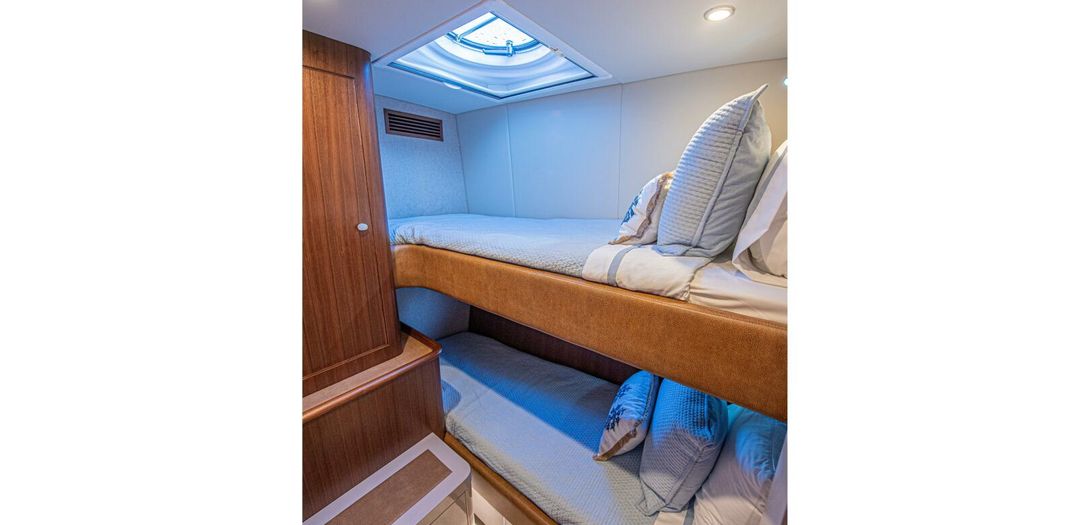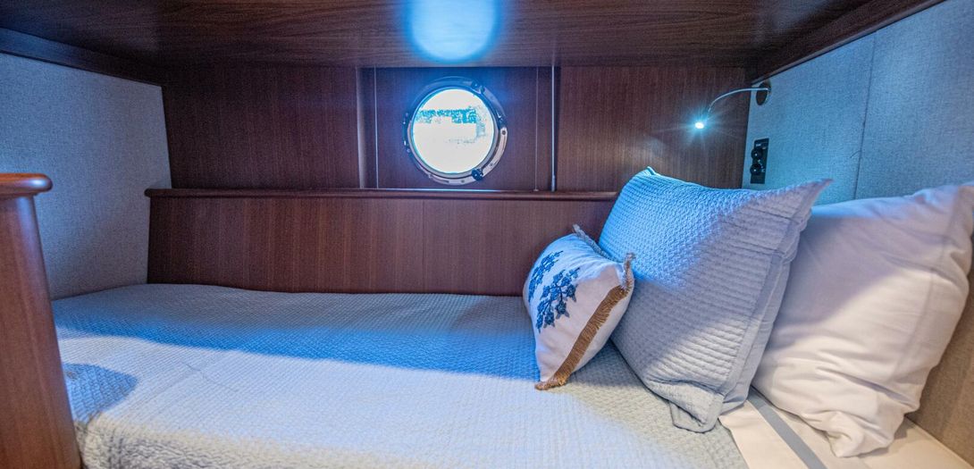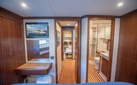 Starboard in the main corridor is the guest stateroom with top and bottom bunks. Not to be treated as the neglected stateroom, Belize equipped the bunk stateroom with an overhead hatch, opening porthole, walnut closet, and lacquered storage drawers.