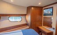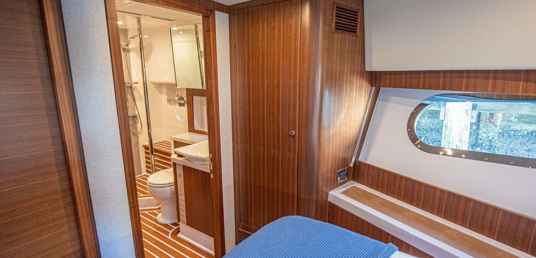 The VIP stateroom sits forward with almost an entirely walk around queen size bed. Dual hanging lockers and below bed drawers offer plenty of storage. Ultraleather wrapped countertops flank each side of the bed serving as extended nightstands. To starboard, a vanity can double as a small desk. The overhead deck hatch gives plenty of natural light and ventilation when needed and another upgraded Smart TV is on the aft starboard bulkhead.