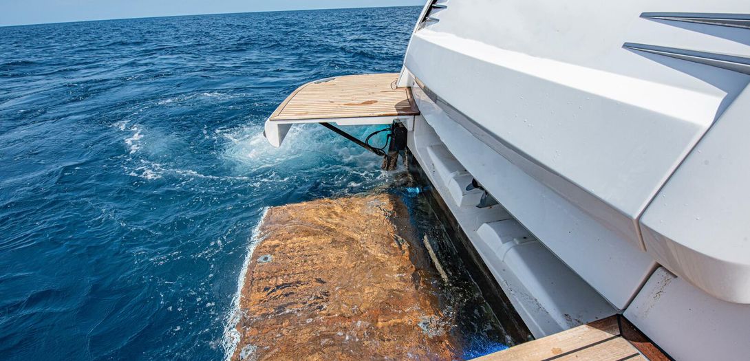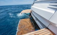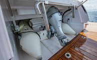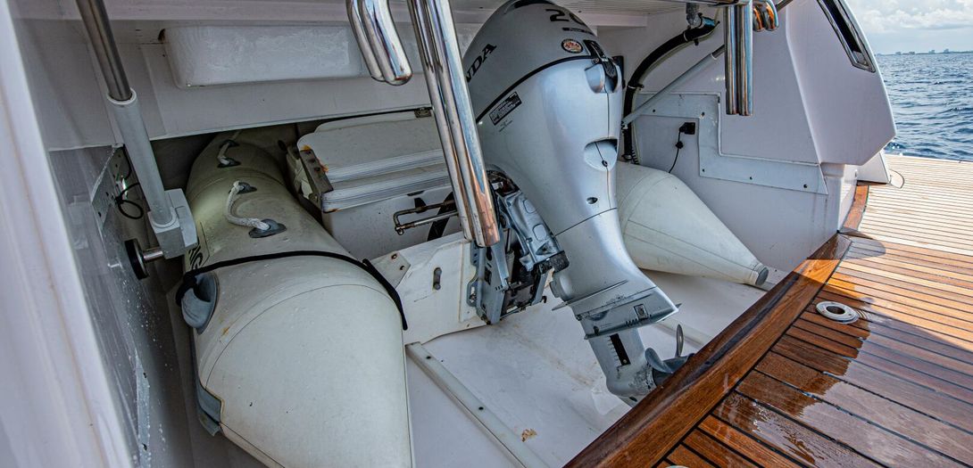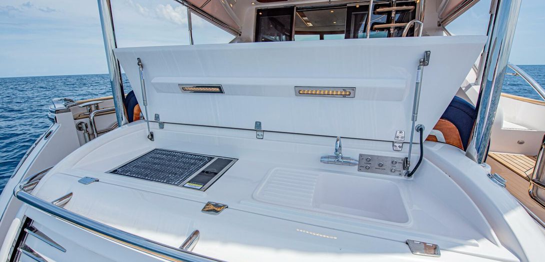 Well-hidden and a surprise to those not familiar with the boat, the transom houses a low-profile tender garage which conceals a Brig Falcon 300 with 20hp four stroke Honda outboard. Belize is one of the few manufacturers that can house an outboard powered tender in a garage, eliminating the need to use a jet tender which are less reliable and require more maintenance. For launching and recoring the tender, the center part of the swim platform lowers, and an electric winch deploys and retrieves the tender. When the tender is stored, a lid opens to reveal a transom wet bar with sink, lighting built into the lid, a Kenyon electric grill, and pull-out transom hot and cold shower.