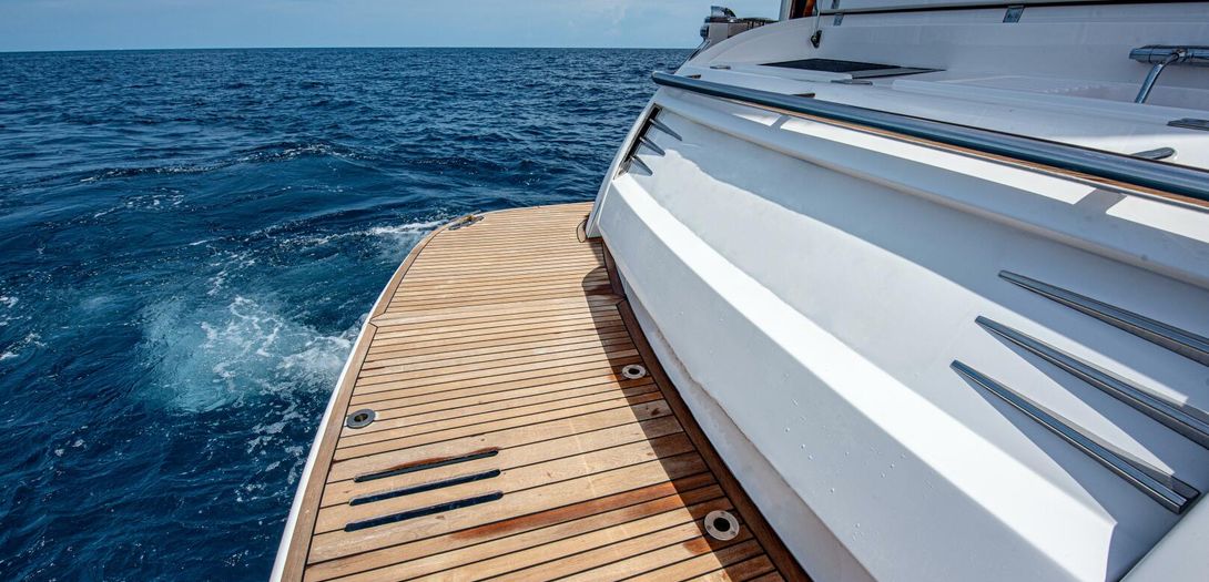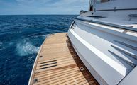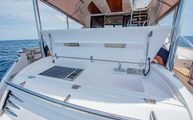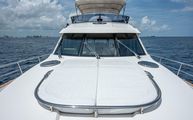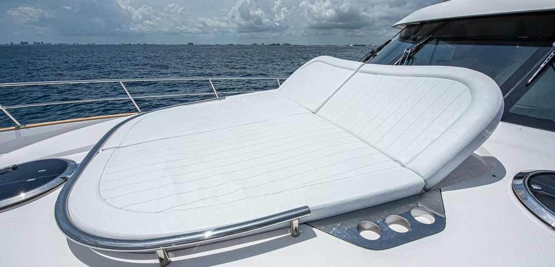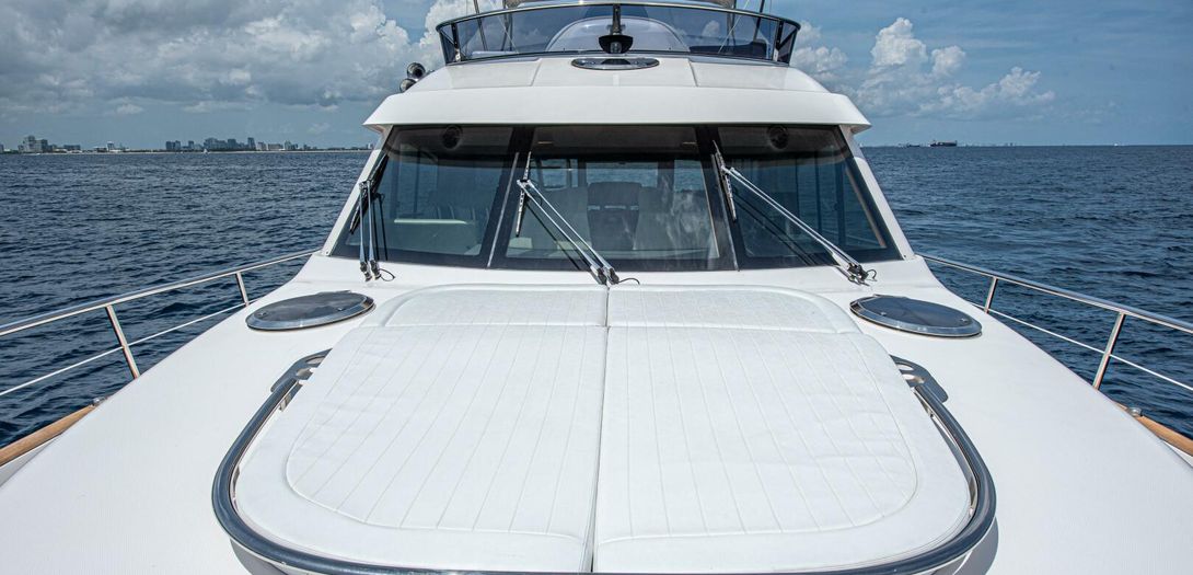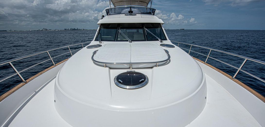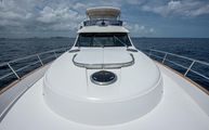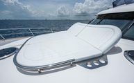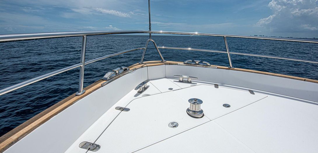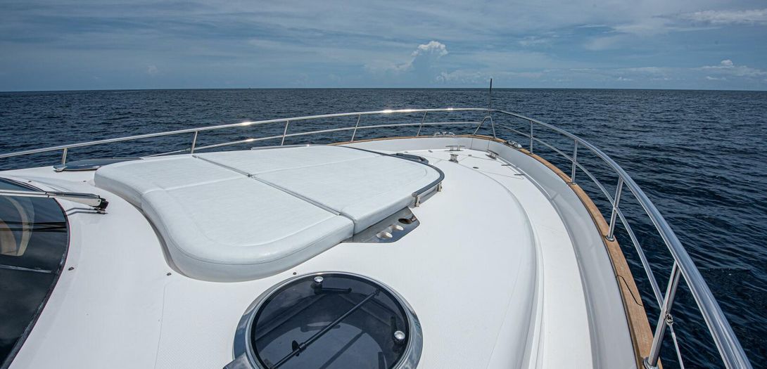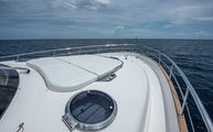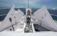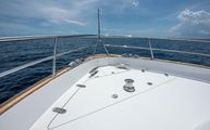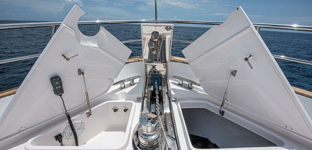 The foredeck is easily accessed through wide walkways on either side with elevated bulwarks decorated beautifully with a teak cap rail and beefy stainless steel bow rails. The beam is carried all the way forward in the boat which makes the forward foredeck very wide and an very easy spot to navigate even while carrying lines, fenders, covers, etc. Even at night the walkway is easily navigated with the help of floor level courtesy lighting. The foredeck superstructure has a very wide vinyl sunpad with folding backrests. The pad is encompassed by an impressive stainless guard rail for added security when lounging. True in form to the classic and timeless lines of Belize, three vintage style round stainless-steel deck hatches can be opened with screens and shades for added comfort below deck.