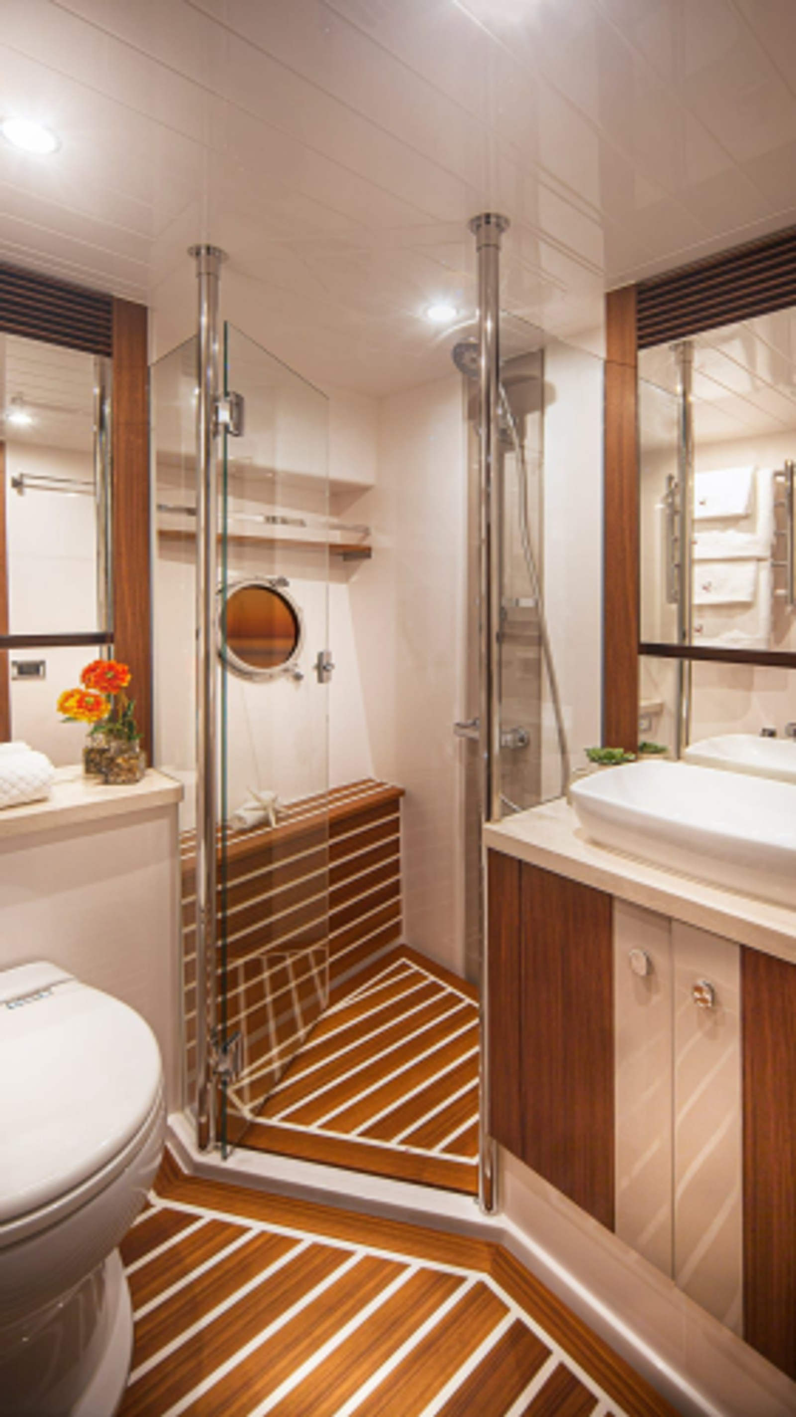 Descend the forward staircase to the accommodation deck. Choose from three or four-stateroom designs with three luxury bathrooms. Option of additional crew quarters or utility room.