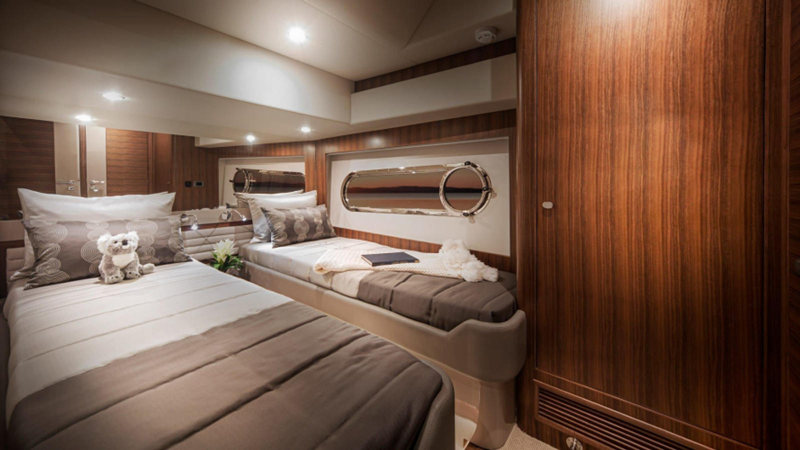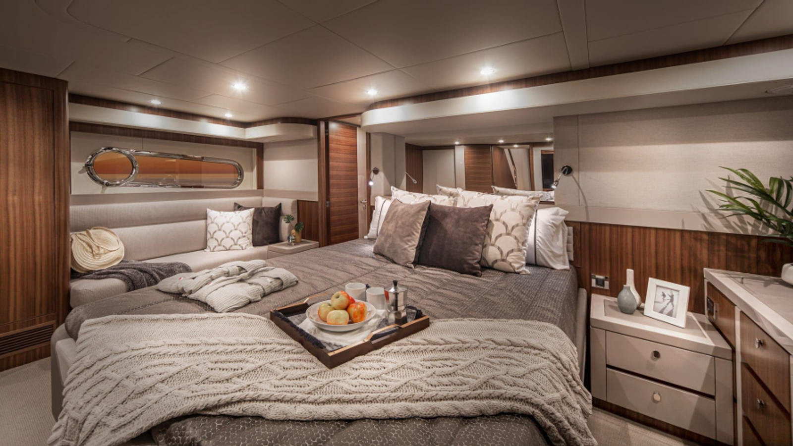 Enter via transom gates into a large, teak-laid cockpit with tender garage beneath, or through the side bulwark doors. Personalise the entire massive saloon area with select fabrics and bespoke finishes. The U-shaped galley, forward dining area and free-standing lounge will all delight. Outside, wide high side decks lead to the sunlovers’ foredeck.