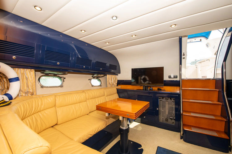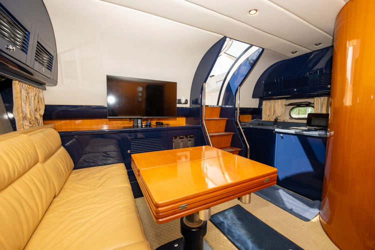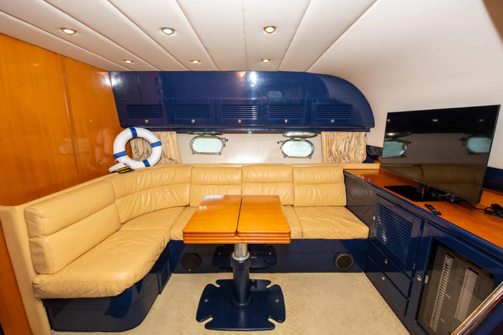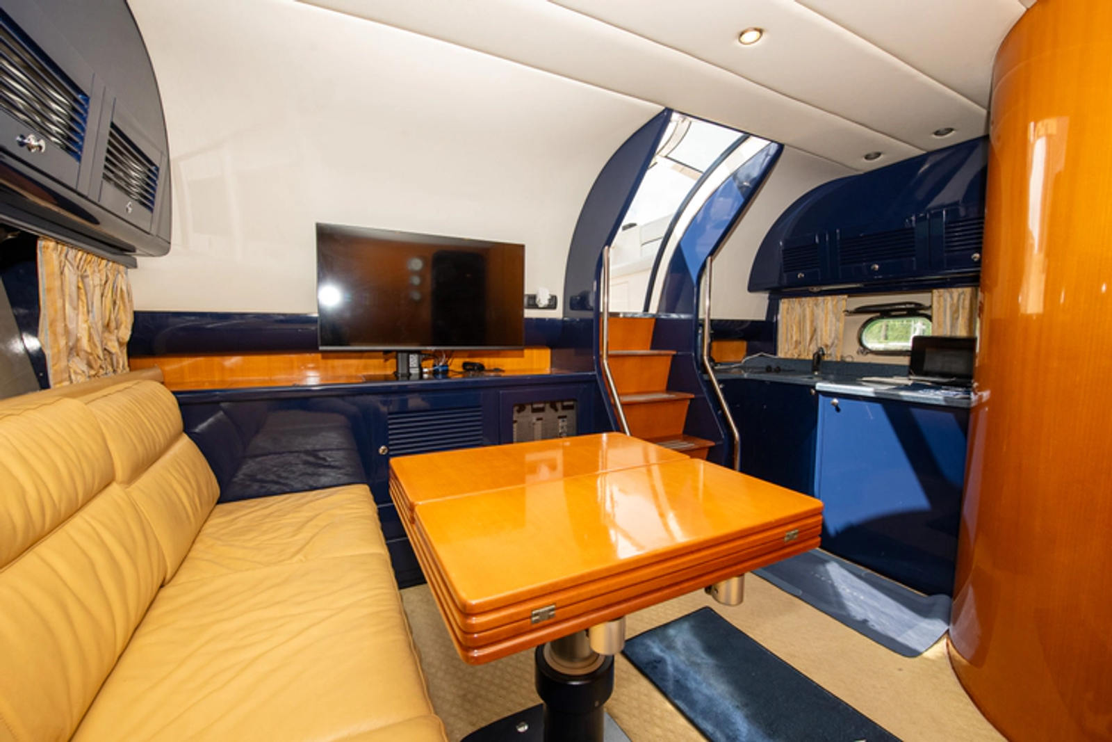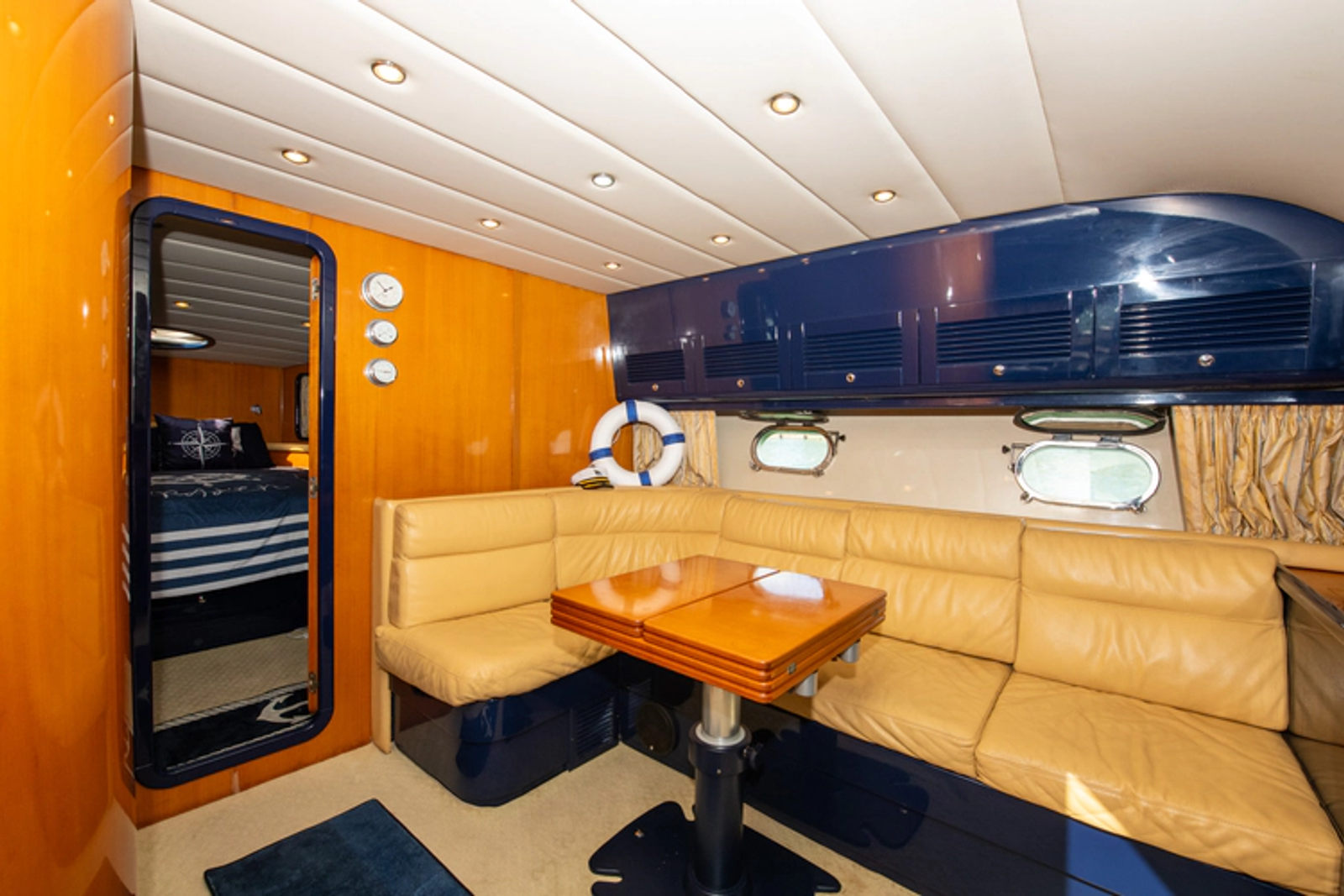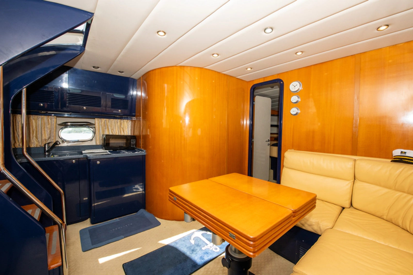 The interior layout features a spacious salon with a comfortable sofa, dining table, and an adjacent fully equipped galley. The vessel offers two true independent suites, positioned apart from one another to ensure exceptional privacy. This thoughtful configuration, combined with the centrally located engine room that enhances stability both at anchor and underway, represents a rare and valuable advantage for a yacht of this size.