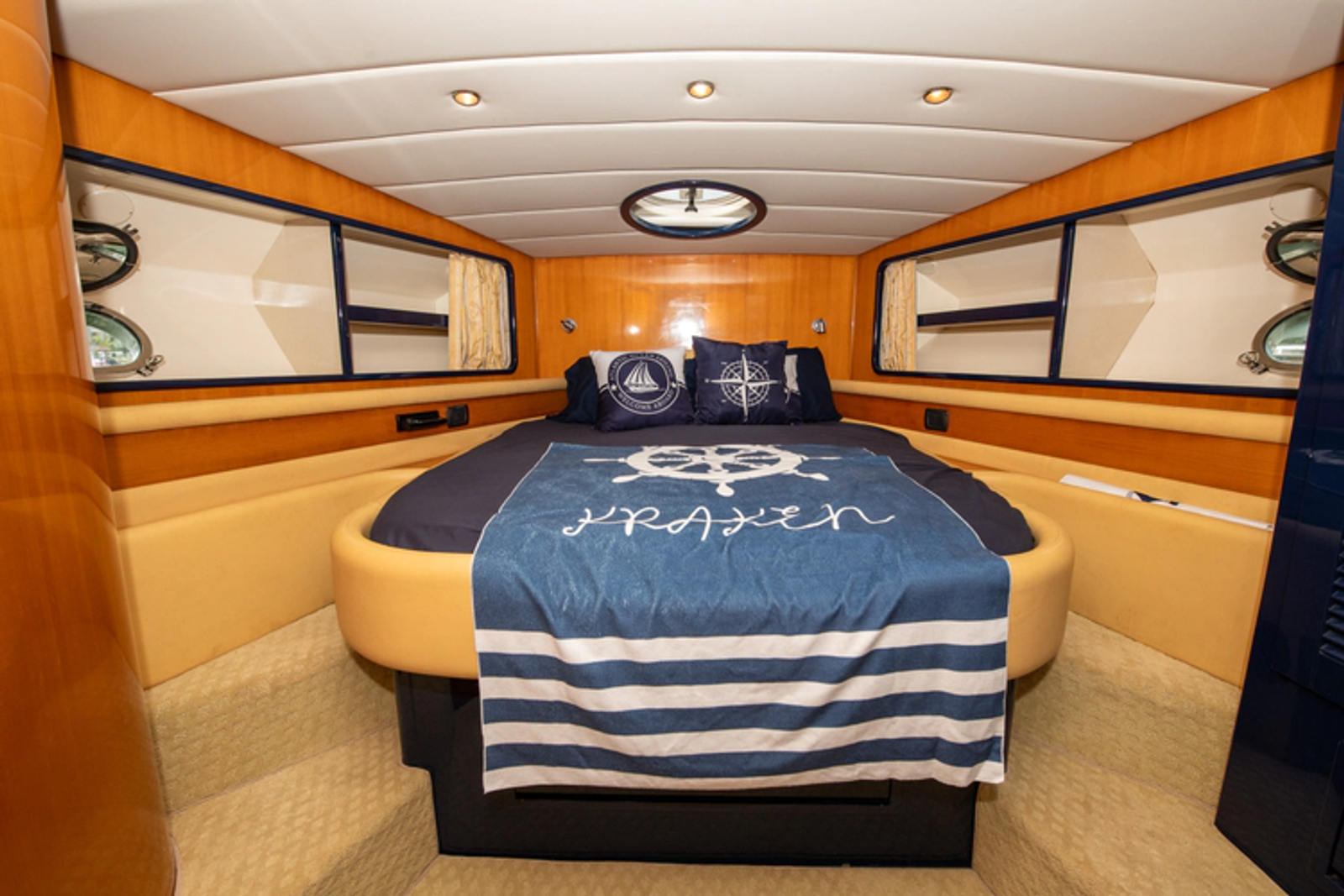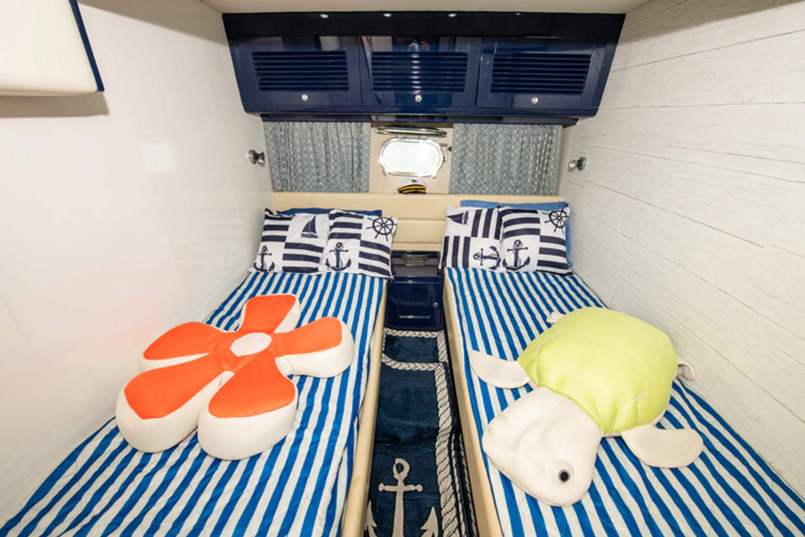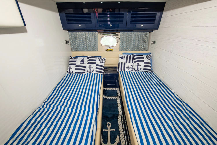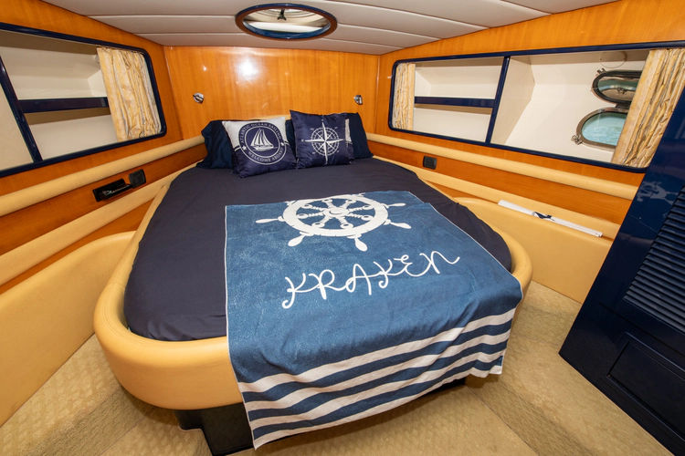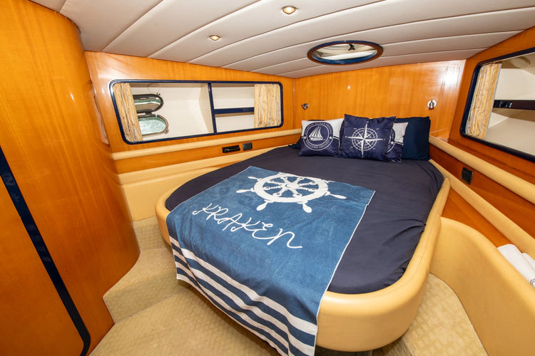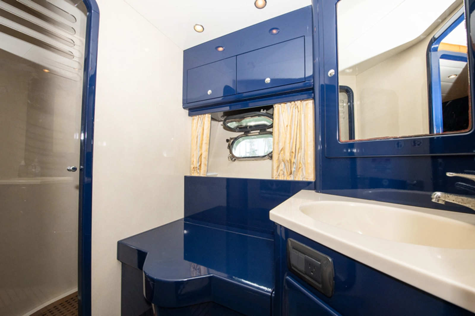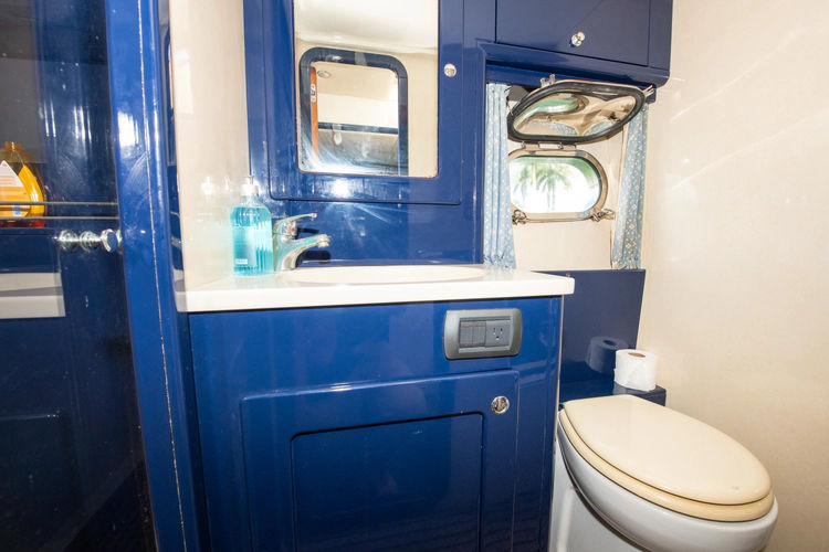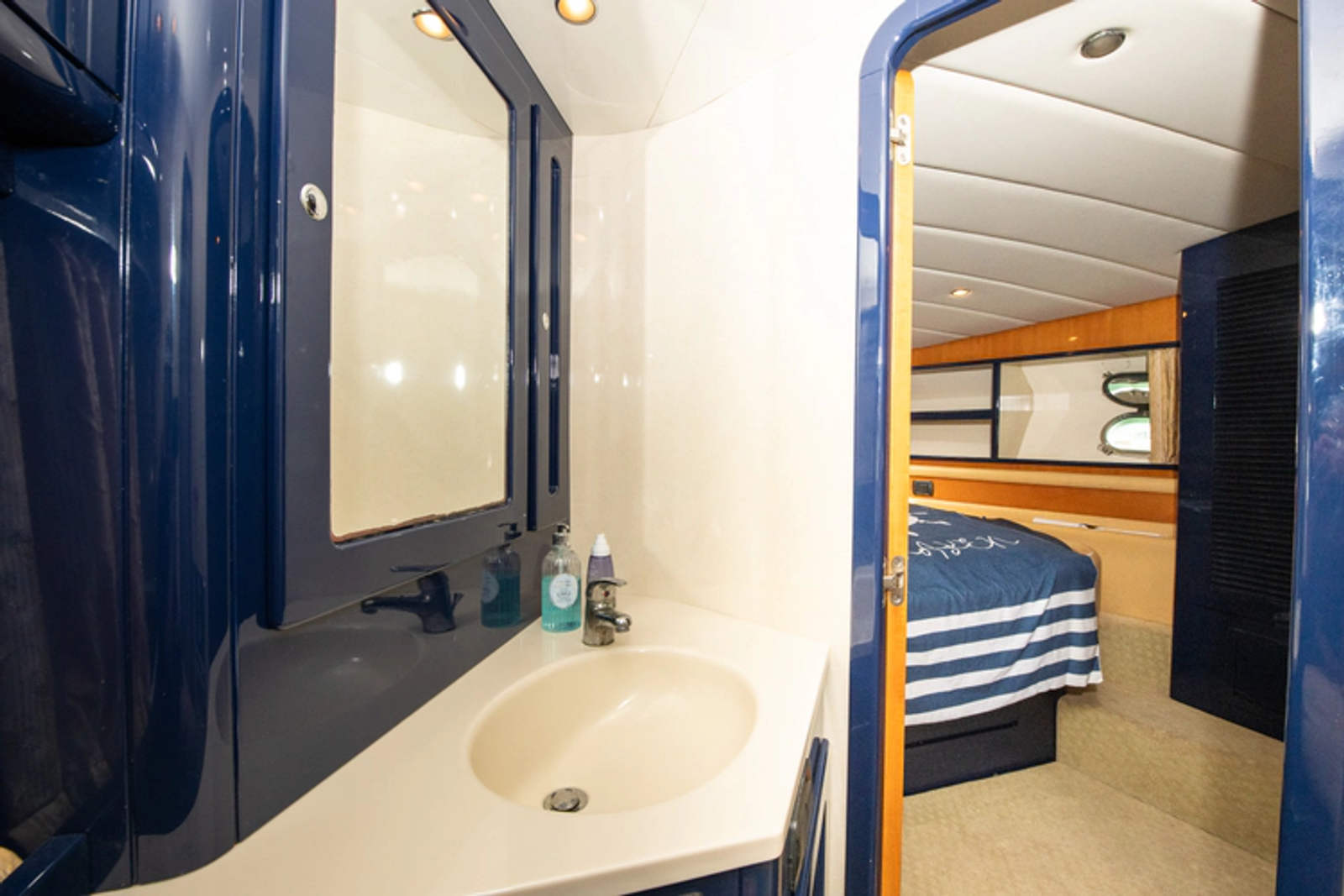 The interior layout features a spacious salon with a comfortable sofa, dining table, and an adjacent fully equipped galley. The vessel offers two true independent suites, positioned apart from one another to ensure exceptional privacy. This thoughtful configuration, combined with the centrally located engine room that enhances stability both at anchor and underway, represents a rare and valuable advantage for a yacht of this size.