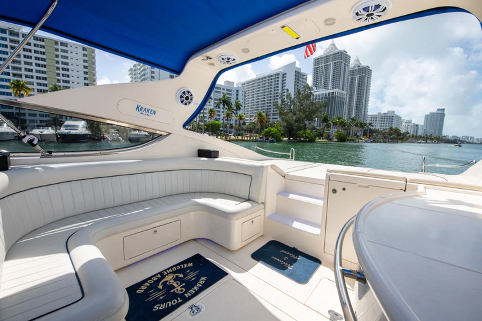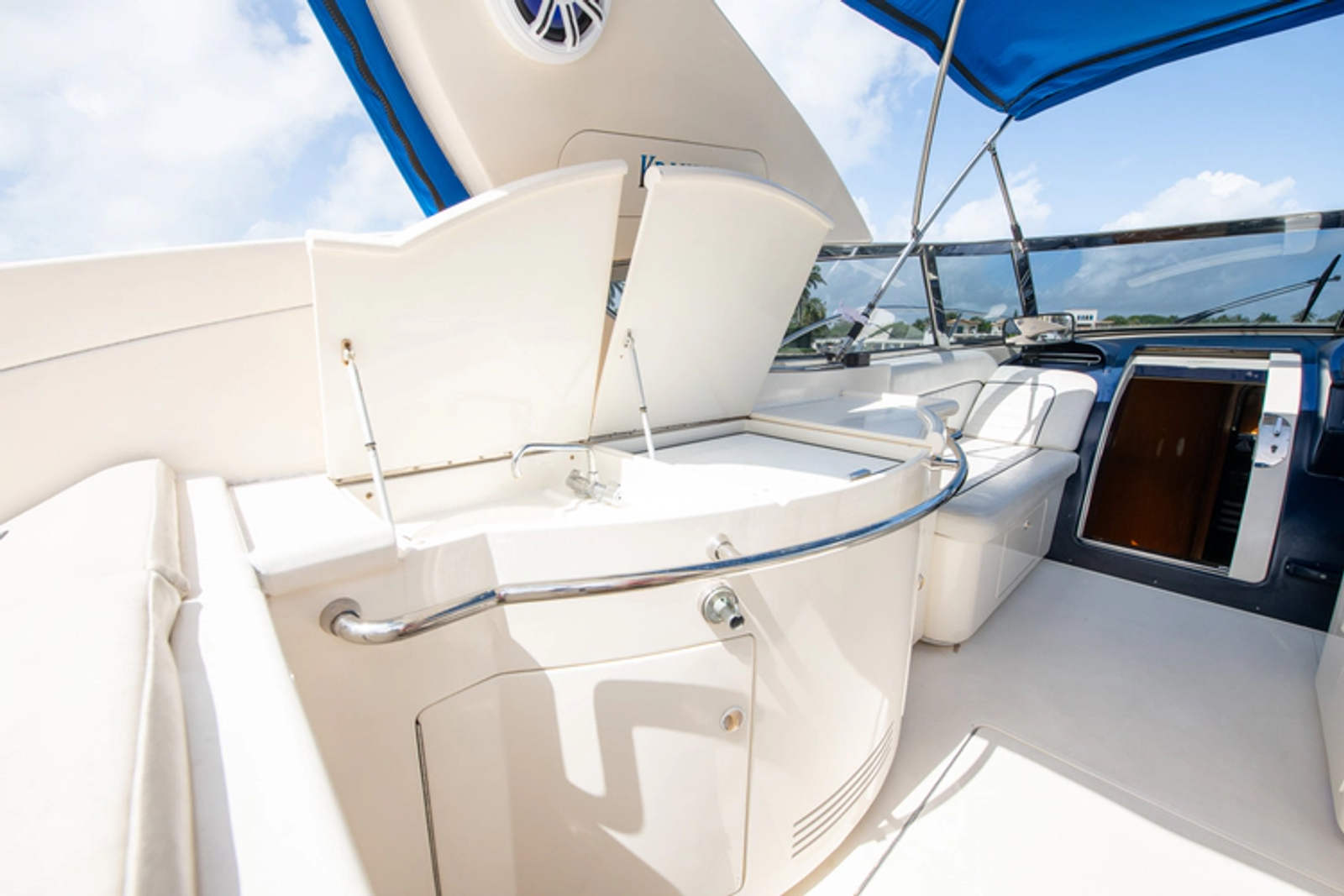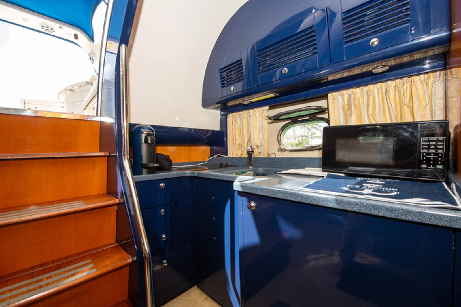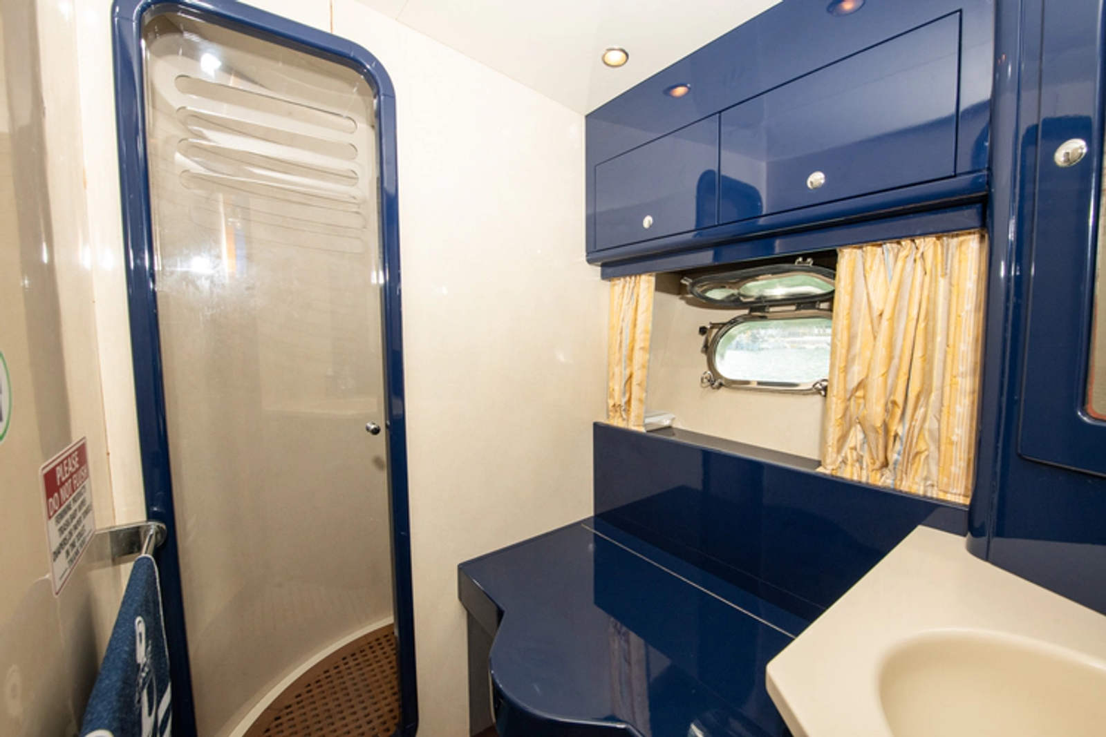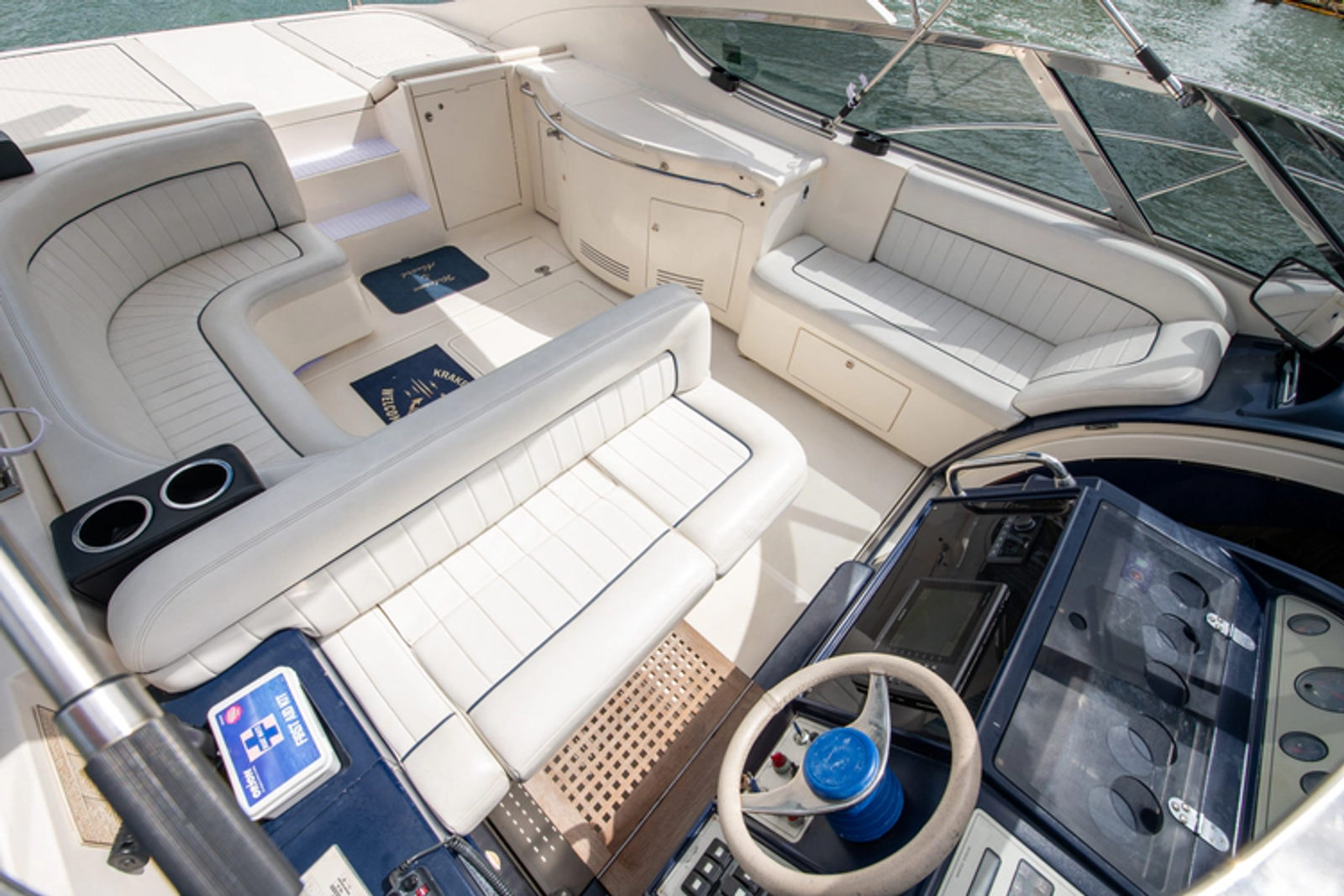 The interior layout features a spacious salon with a comfortable sofa, dining table, and an adjacent fully equipped galley. The vessel offers two true independent suites, positioned apart from one another to ensure exceptional privacy. This thoughtful configuration, combined with the centrally located engine room that enhances stability both at anchor and underway, represents a rare and valuable advantage for a yacht of this size.