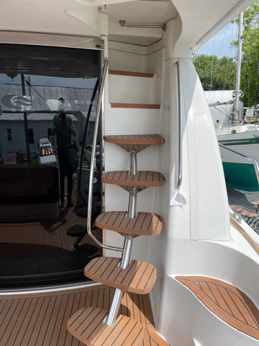 Ascending the steps to the Pilothouse, there is a door to starboard leading out to the gunnel and foredeck access. Forward is the staircase to the cabins forward. More to port is the set of steps leading to the flybridge, which can be closed off with a plex angled door.