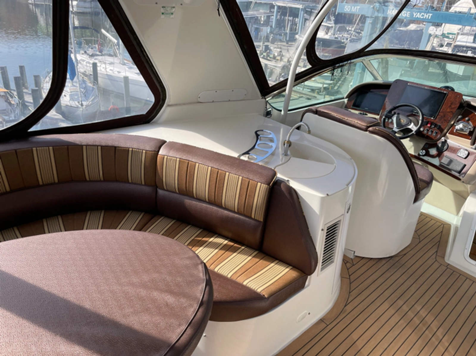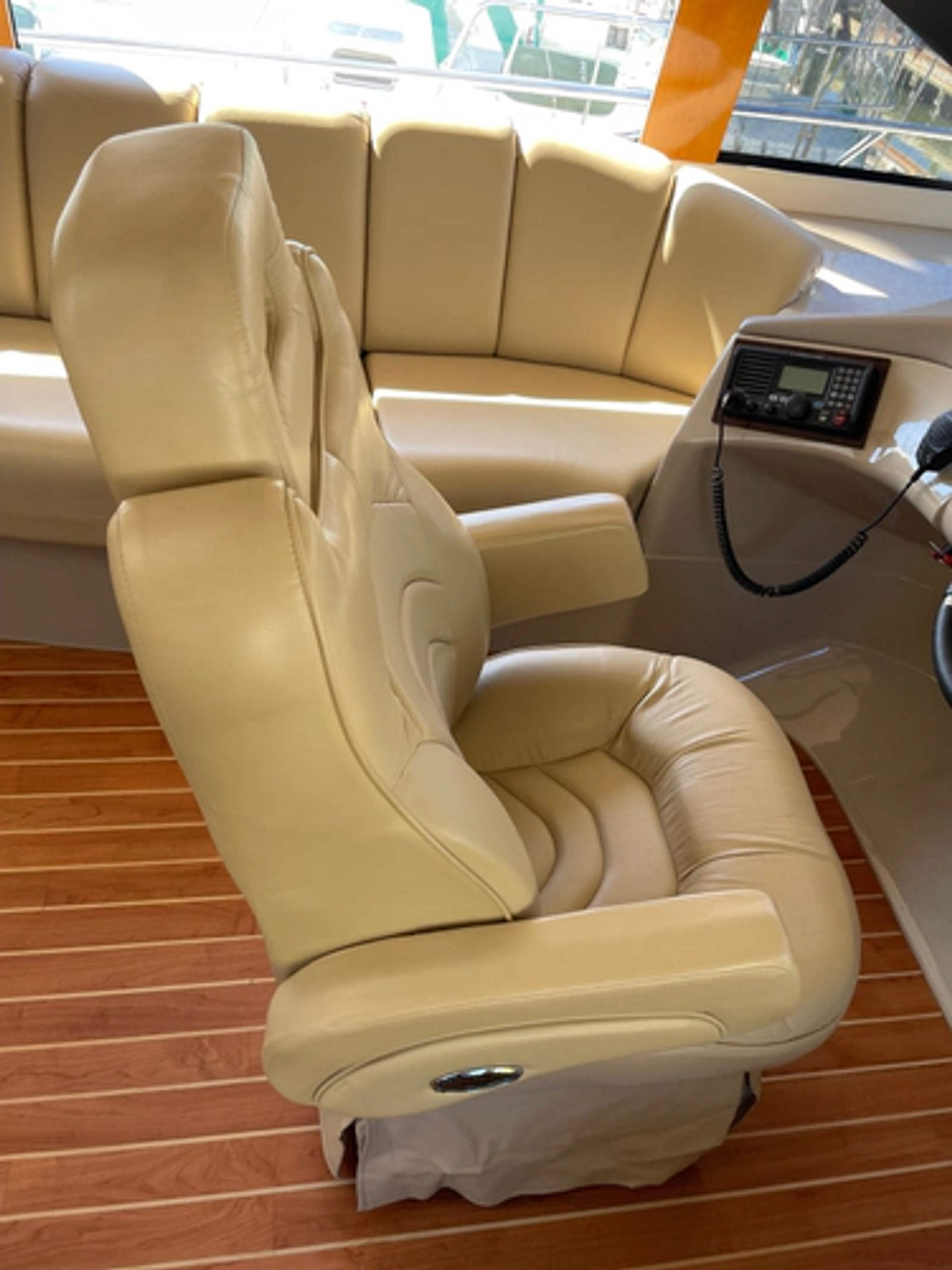 To the port is a large L-shaped lounge. The captainand#39;s chair swivels and adjusts in multiple planes. The helm dash is arrayed along and across the windshield. There are defoggers to keep the glass clear. facing aft, there is a good view of the salon.