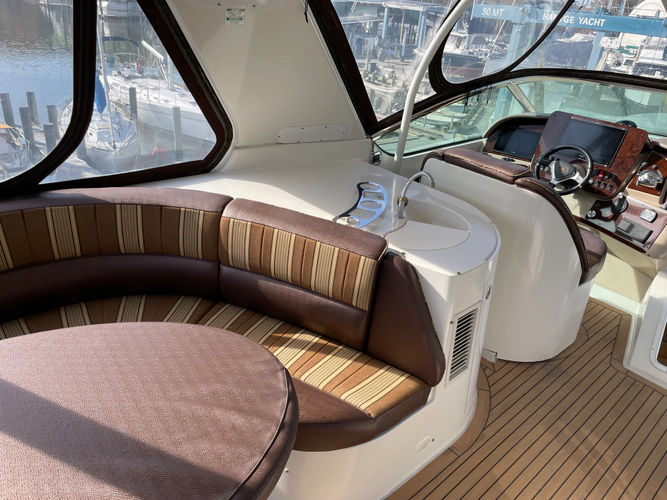The cockpit has faux teak flooring. There is a comfortable, forward-facing rear bench seat with sunbrella cover. There is a storage compartment beneath the seat. There is a set of cockpit helm controls in the port rear corner. Forward of that to port are the teak-covered, gentle steps to access the gunnels and forward to the bow. The bulkhead has controls for cockpit stereo and lighting.