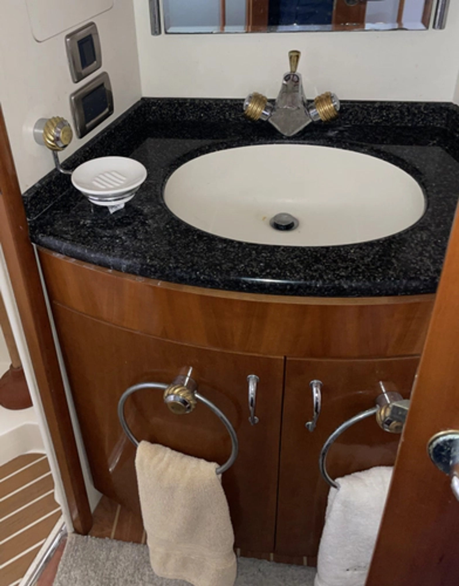 Boarding the boat from aft, you encounter the spacious swim platform/hydraulic lift system. The platform is covered in faux teak. There are two storage compartments in the transom, for line storage and to access switching, hot and cold transom shower, fresh and raw water washdowns. There are two Cablemaster ports and switching built into the transom. Forward you access the cockpit via a transom door.