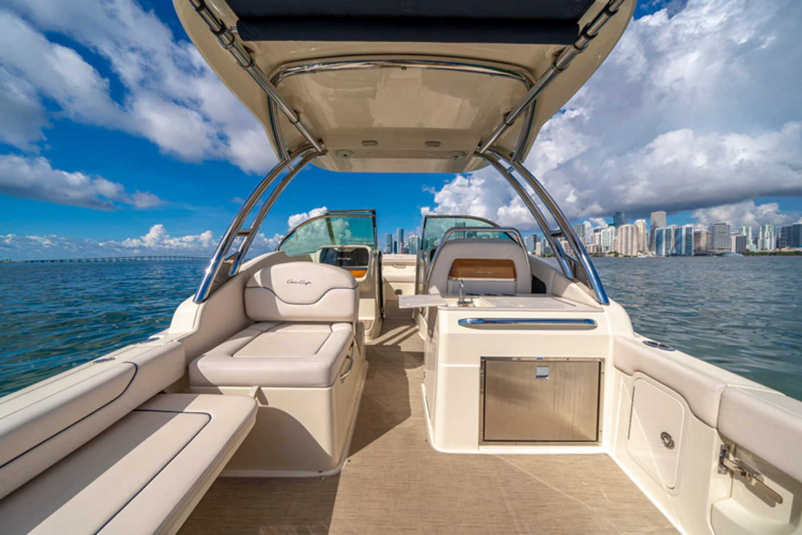 The cockpit is spacious and thoughtfully designed, featuring comfortable seating, a live well for fishing enthusiasts, and high-quality materials throughout. A full enclosure mooring cover provides protection when not in use, while underwater lights add a striking aesthetic for evening outings.