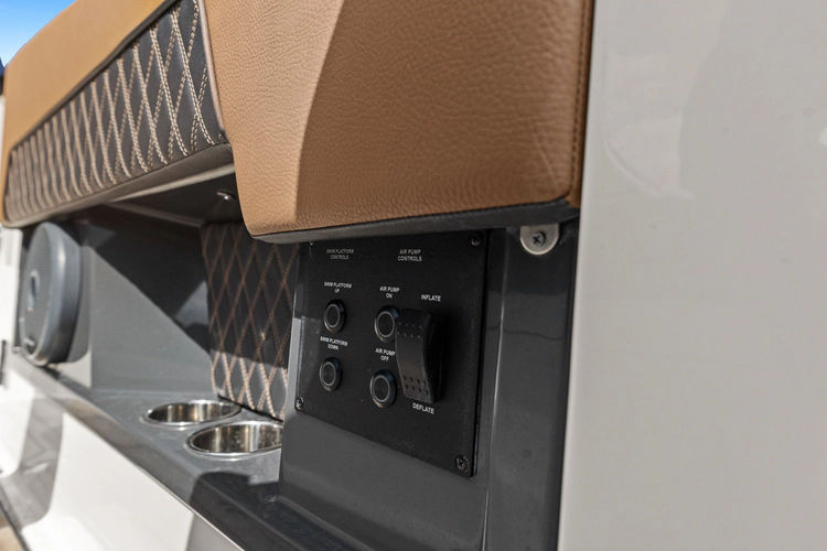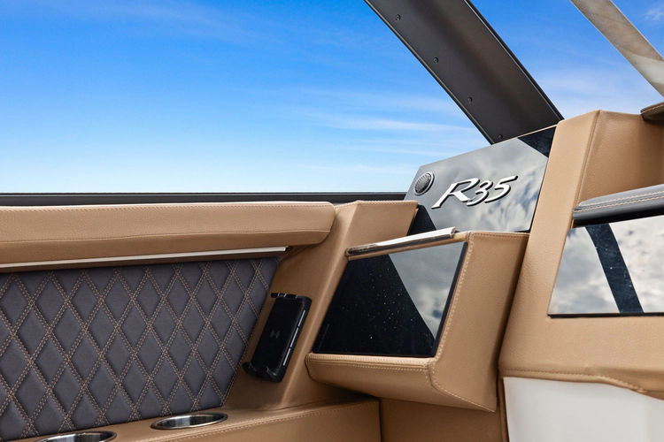 The largest member of the R Series, the R35 maintains the elegantly sleek lines and innovative geometry of the series while displaying a strikingly noticeable presence. Its added room makes the R35 the ideal platform for a number of exciting innovations, including Helm Watch, offering passengers access to charts and cabin controls, and a space-saving, pop-up galley that deploys at the touch of a button. Great for water activities, the entire full-width swim platform lowers below the water hydraulically with the push of a button, offering easy access in or out of the water and into the boat.
