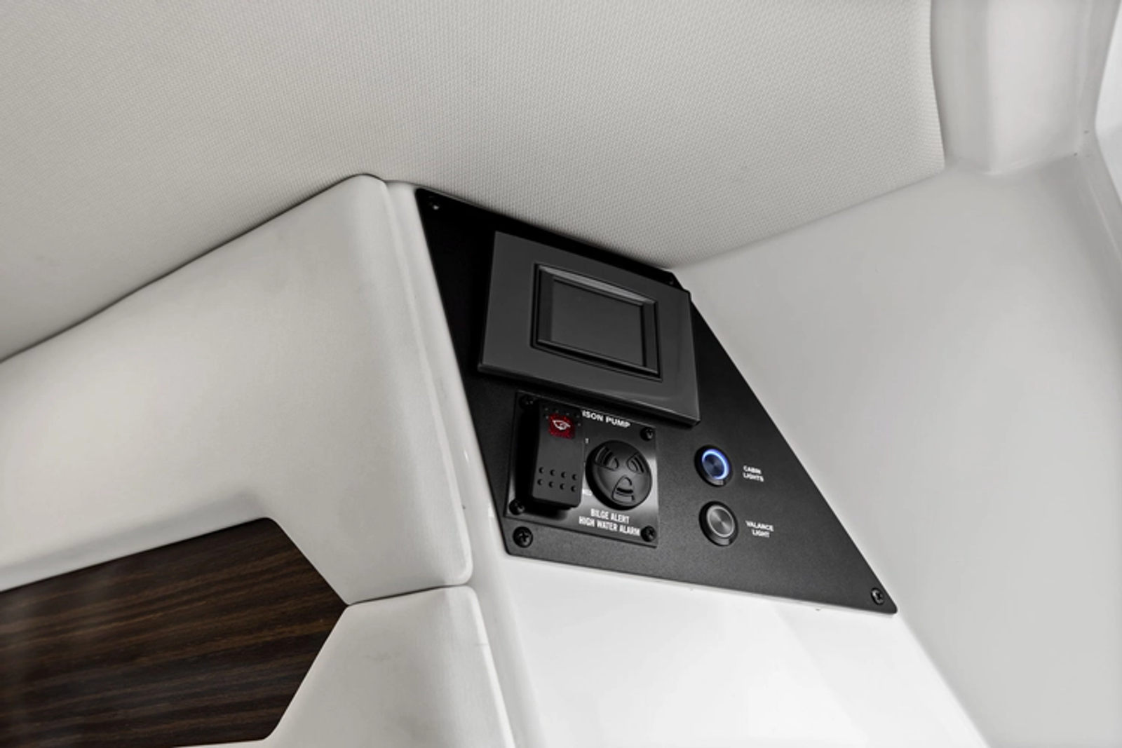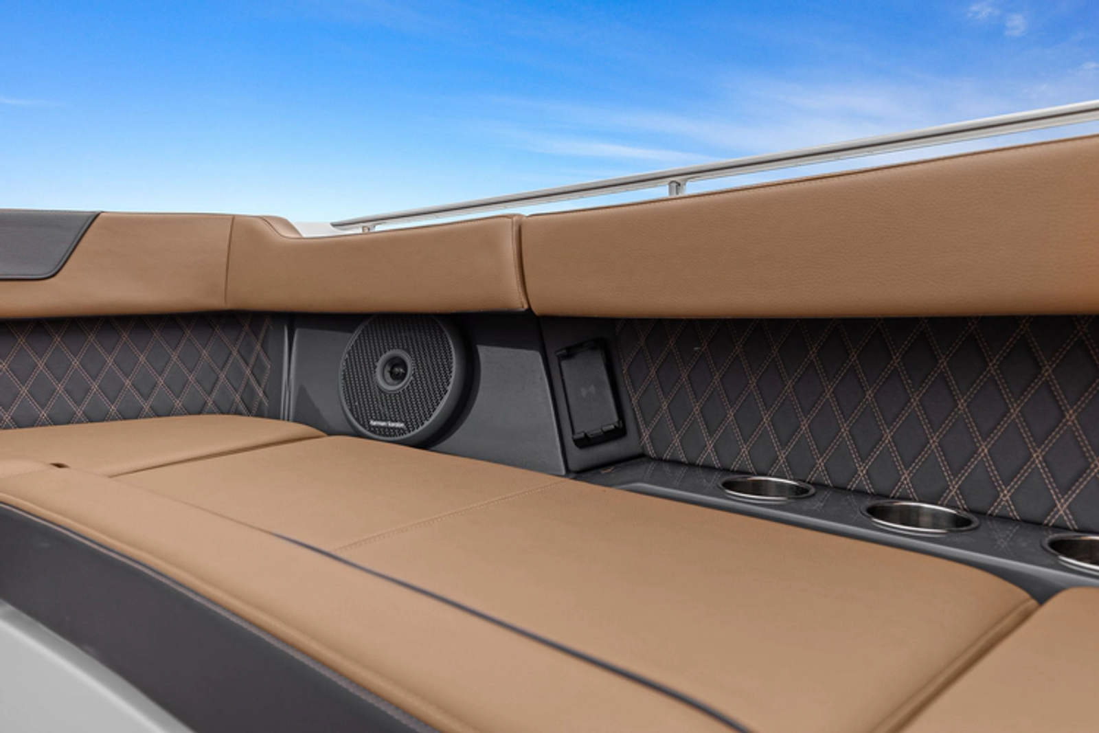 Continuing the Cobalt theme of luxury materials and unmistakable quality, the R35’s finely tailored upholstery covers an enormous amount of seating in an array of modern colors and textures from stem to stern. The ergonomic helm features dual Garmin glass cockpit touchscreens, while the passenger area offers such amenities as a stowable oversize teak table and an ingenious Freezer/Fridge combo unit that gives you both functions in one space-saving package.