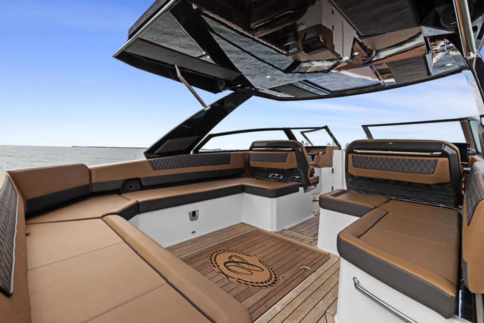 The cockpit is designed as a true social space, featuring:- Hardtop with electric awning