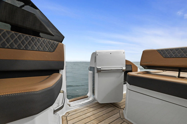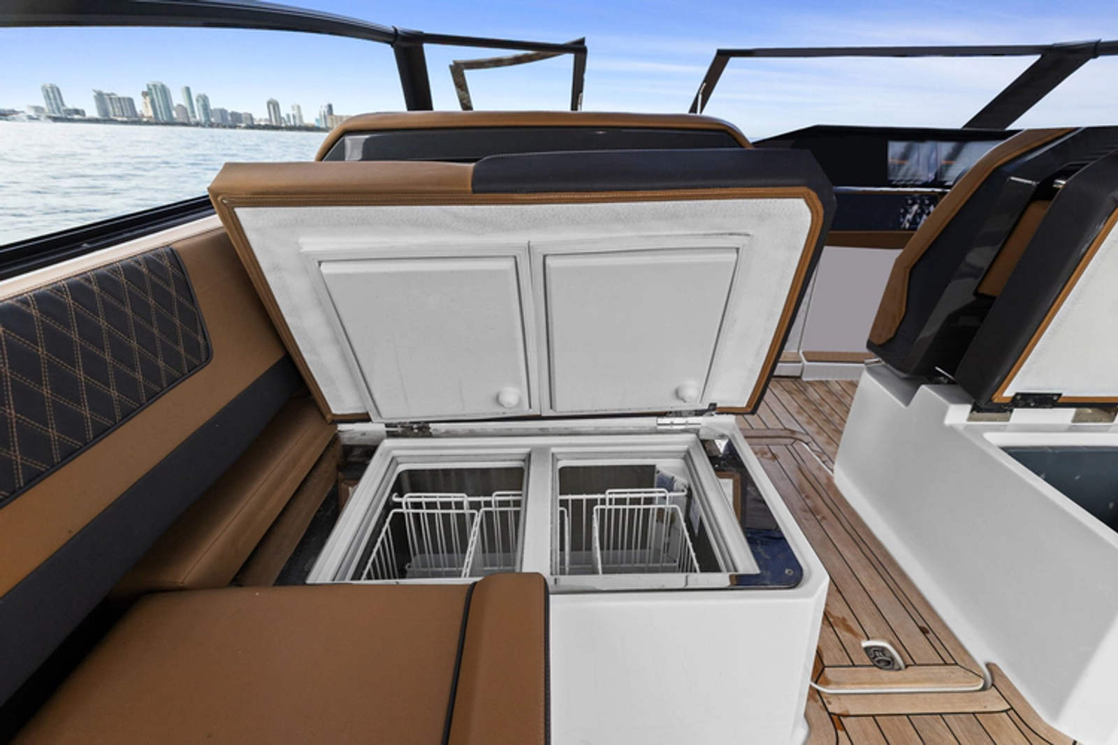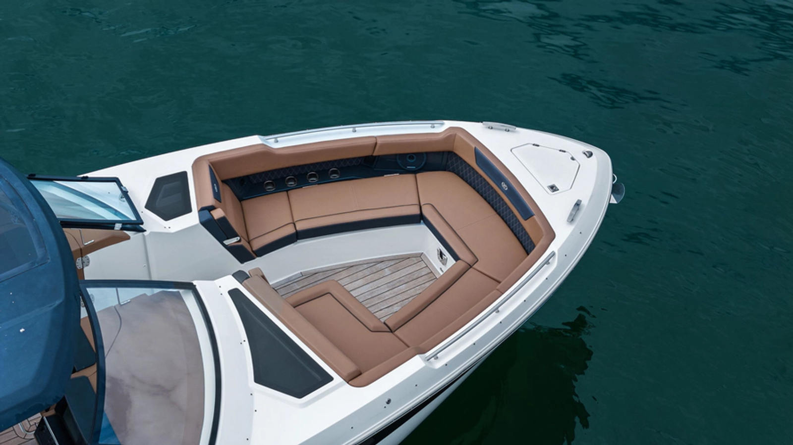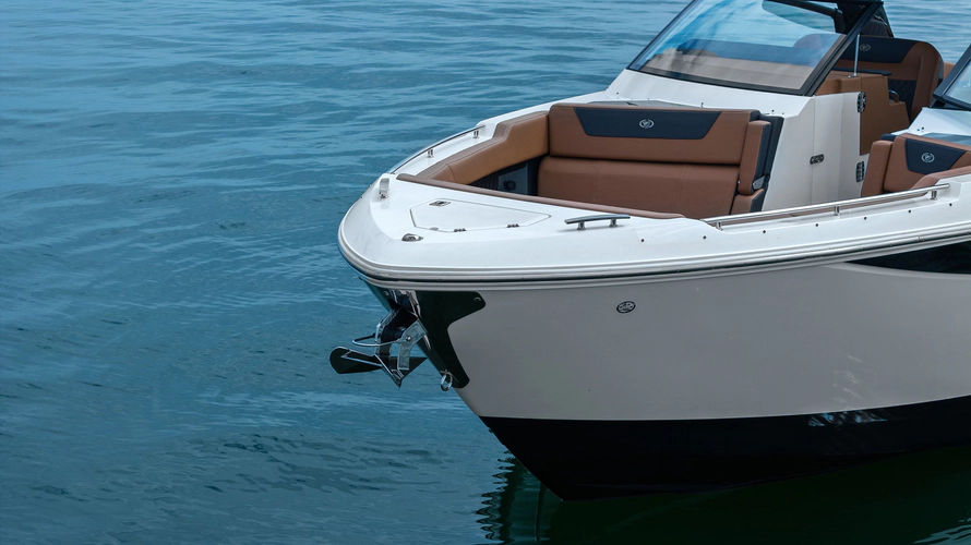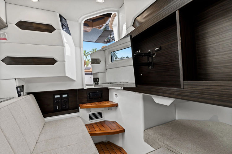Continuing the Cobalt theme of luxury materials and unmistakable quality, the R35’s finely tailored upholstery covers an enormous amount of seating in an array of modern colors and textures from stem to stern. The ergonomic helm features dual Garmin glass cockpit touchscreens, while the passenger area offers such amenities as a stowable oversize teak table and an ingenious Freezer/Fridge combo unit that gives you both functions in one space-saving package.