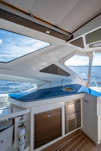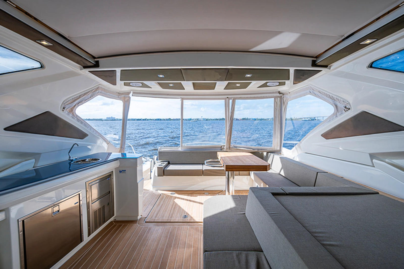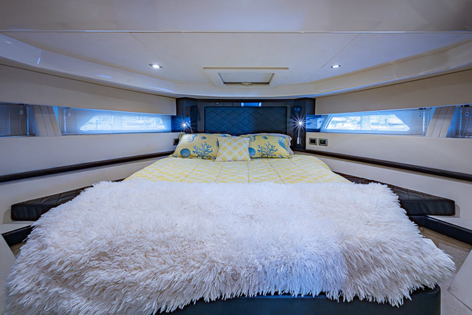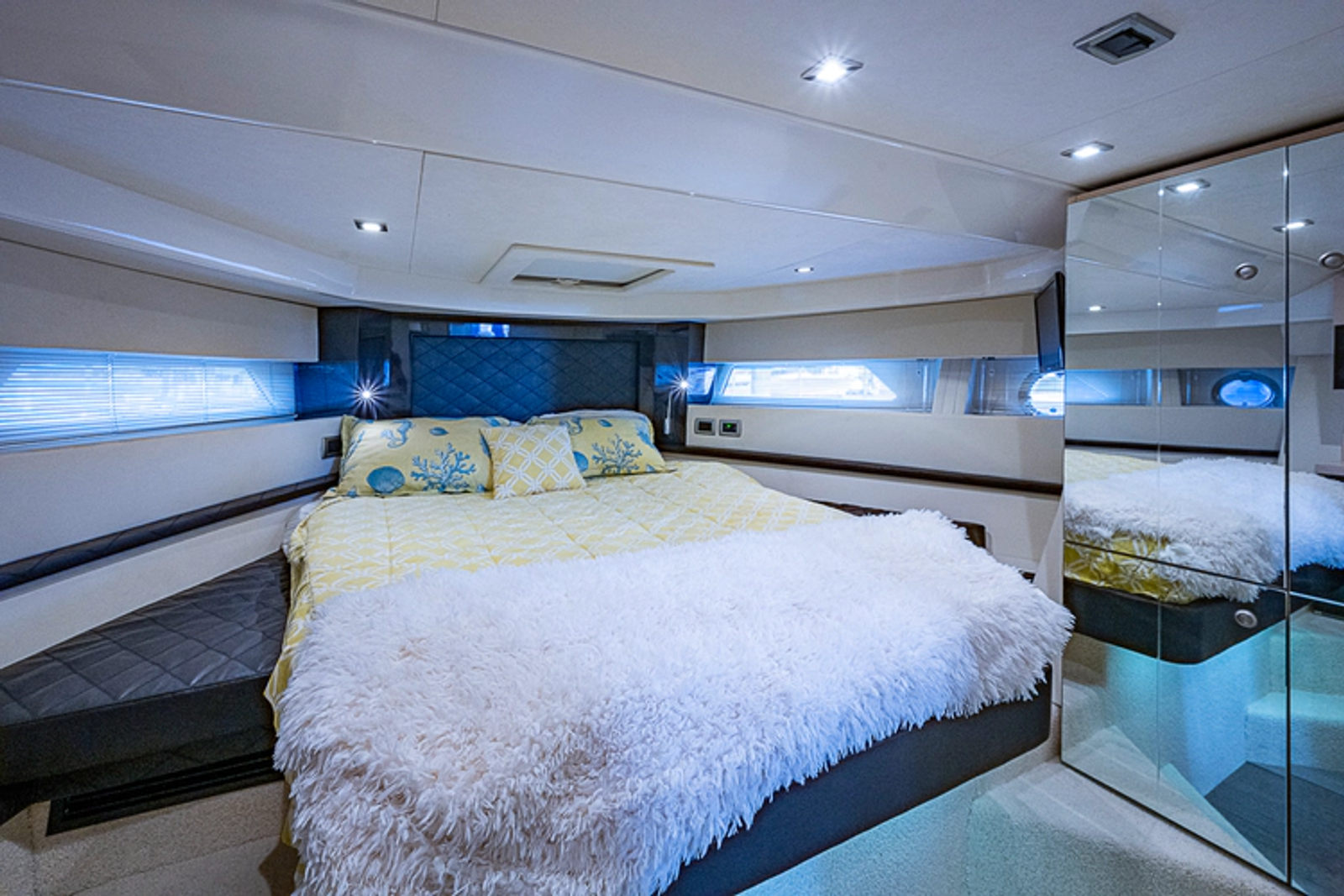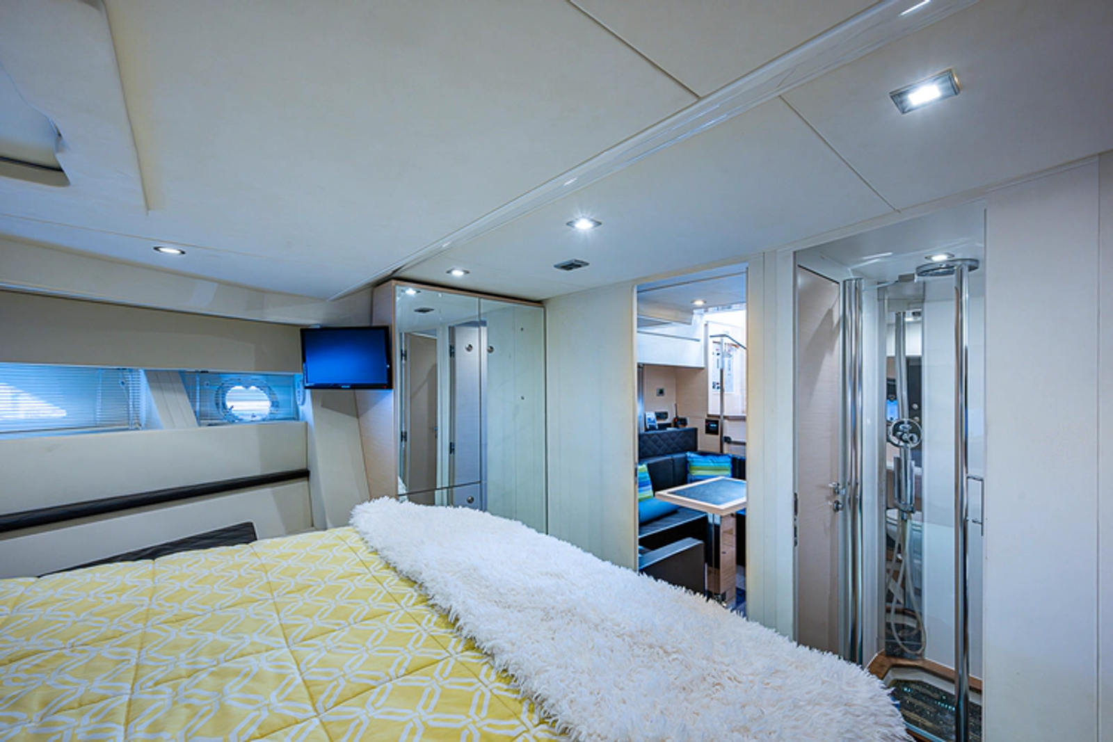 •Lounge to port of helm chairs•Centerline queen birth