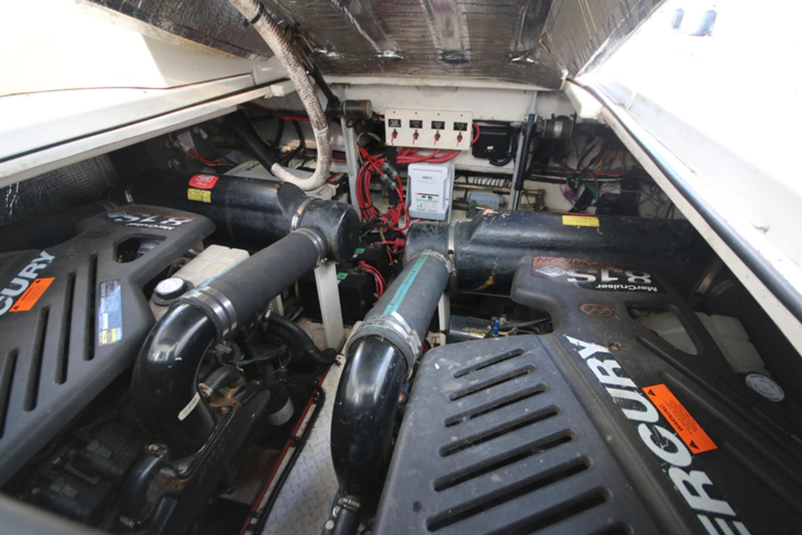 The twin Mercruiser 8.1 liter engines, 4 bladed Nibral props and stainless steel shafts provide ample power to move the boat efficiently, and the twin screws make maneuvering easier.The main cabin is located forward in the V, and consists of a large double configured at a diagonal for maximization of space. There are drawers and lockers for storage, as well as a curtain for privacy.