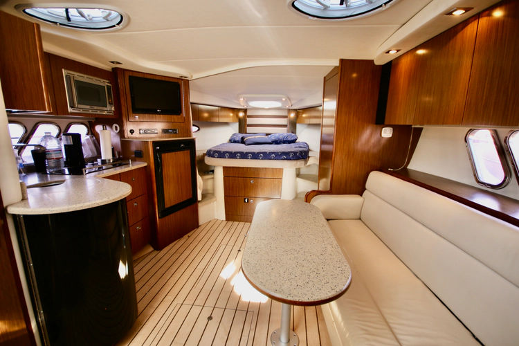 The interior configuration is perfect for a couple with occasional guests, and the boat has all the amenities needed for comfortable cruising.
