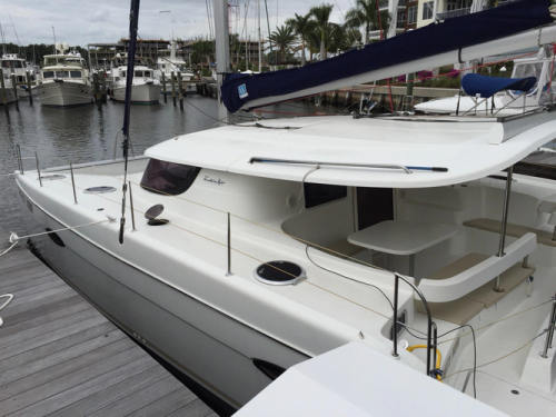 Port hull with separate aft and forward cabins. Queen berth aft. V-berth forward. Each cabin has its own en-suite head.