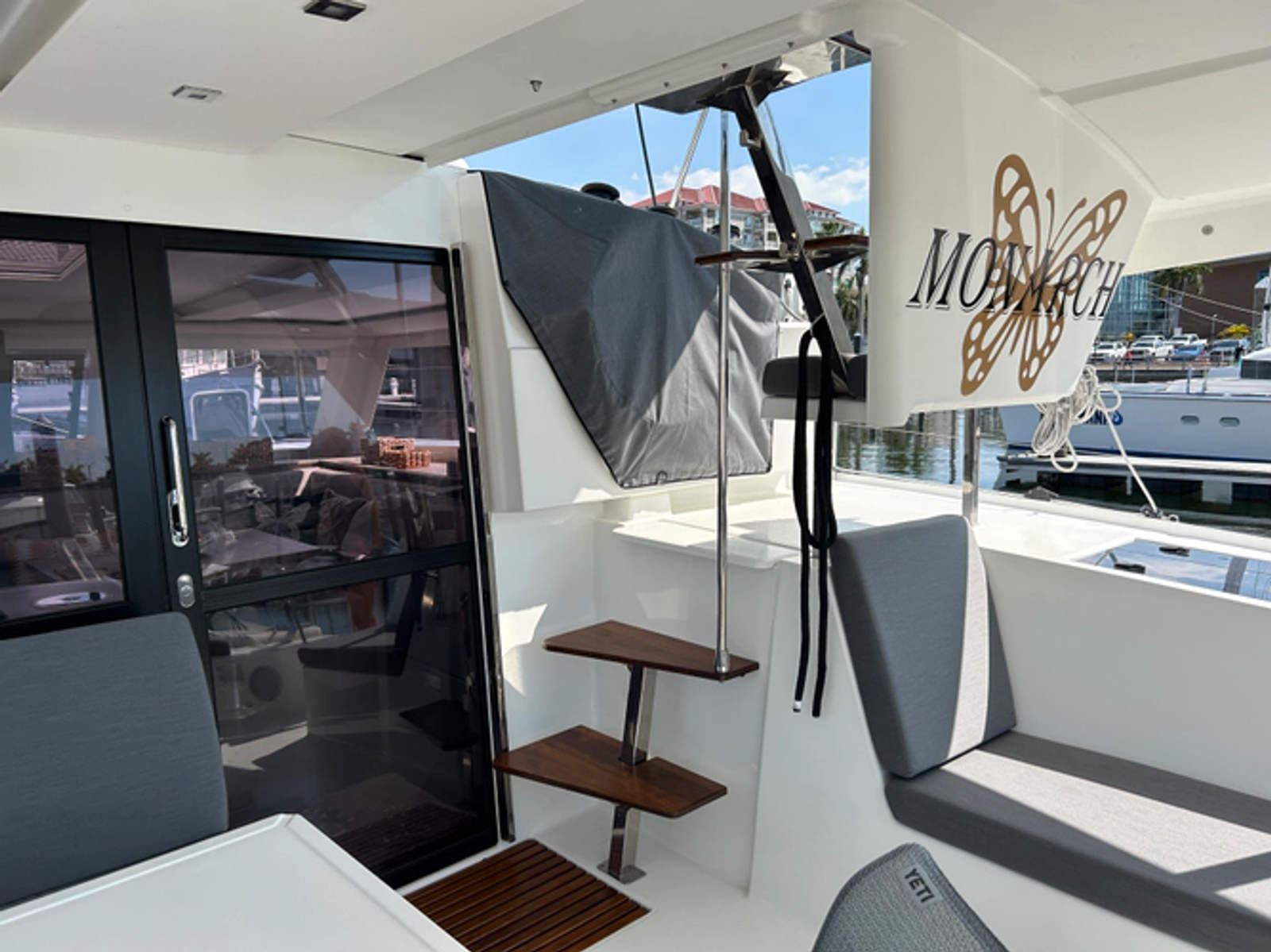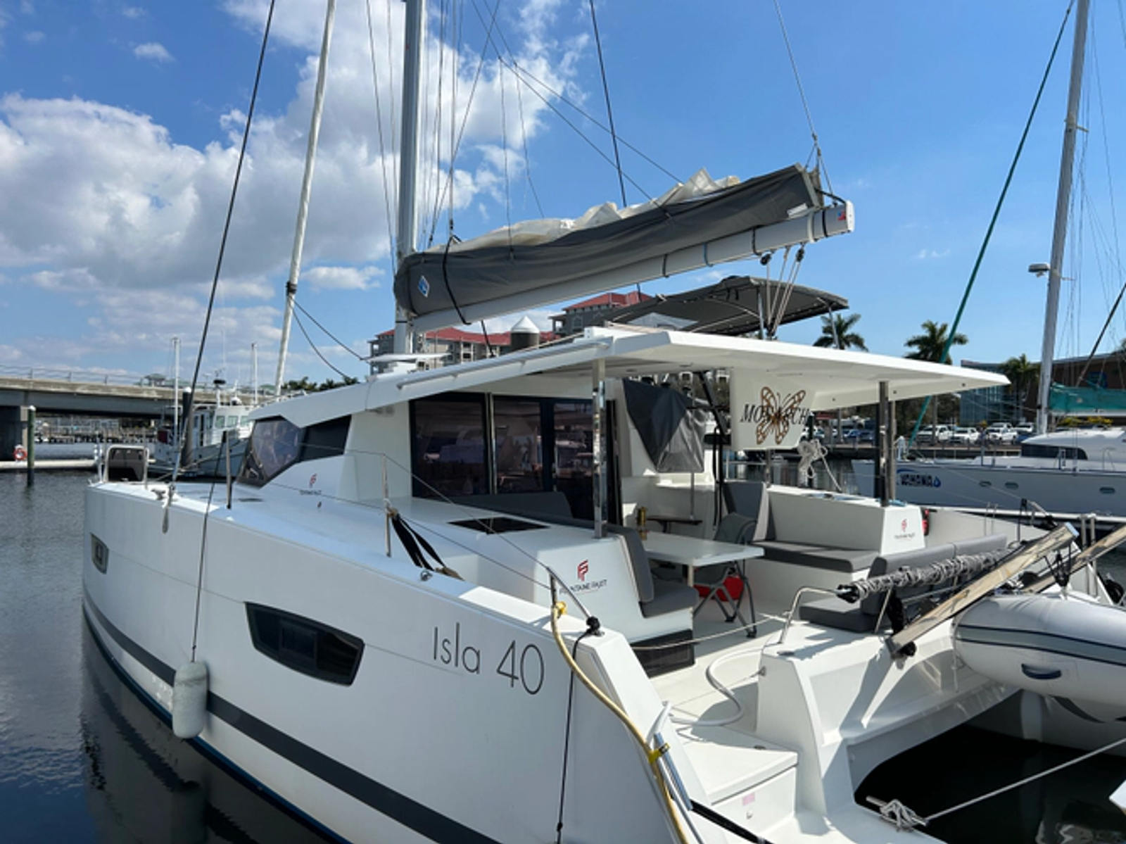 The 2021 Fountaine Pajot Isla 40 "Monarch" is a well-equipped Owner’s Version (3 cabin / 3 head) that entered service in January 2022 and proved her pedigree with an Atlantic crossing on her own hull. Powered by twin Volvo D1-30F engines and complemented by a factory-installed 7.5 kW Onan/Cummins generator, she offers full climate control with three-zone air conditioning, a 2000W Victron inverter/charger, and a robust US-spec electrical system with 50-amp shore power. The sought-after starboard owner’s hull features a queen berth aft, private electric head, and separate walk-in shower, while the port hull provides two additional en-suite cabins - making her equally suited for private cruising or charter. Outfitted with the Isla Comfort Pack, upgraded Bose audio, Garmin navigation suite with radar and AIS, electric winch and windlass, pressurized seawater system, extensive anchoring gear including Mantus hardware and dual chain rodes, plus a 2025 Highfield tender with Mercury 5HP outboard, Monarch presents as a turnkey cruising catamaran ready for her next adventure.