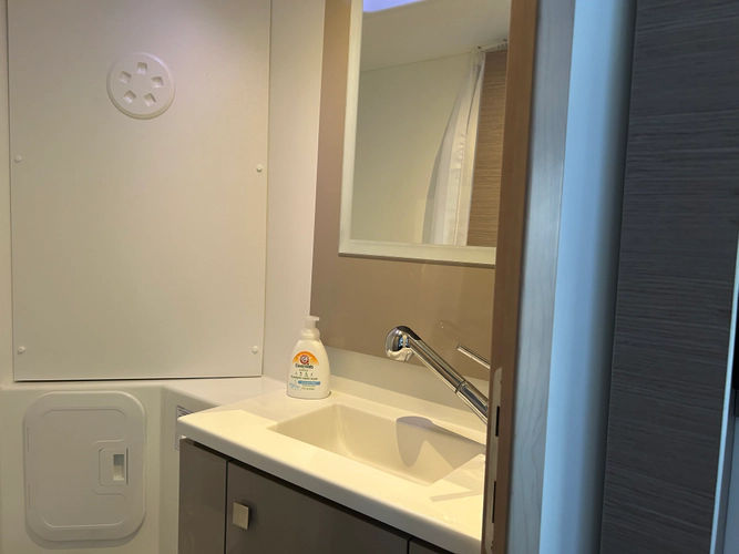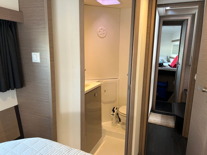 Starboard owner’s hull with queen berth aft and head area forward. Owner’s head in separate privacy compartment with electric head. Separate walk-in shower.