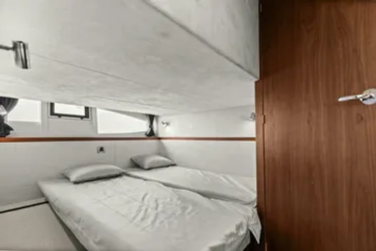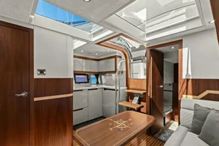 - 2 cabins, 2 heads with ample headroom and elegant woodwork, generous natural light from skylights and hull windows