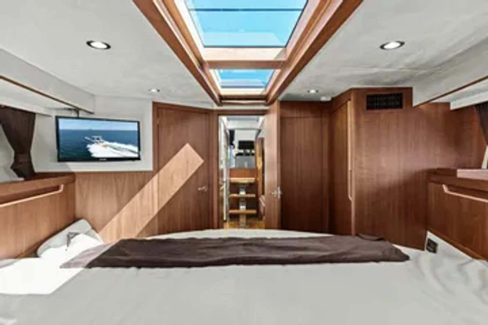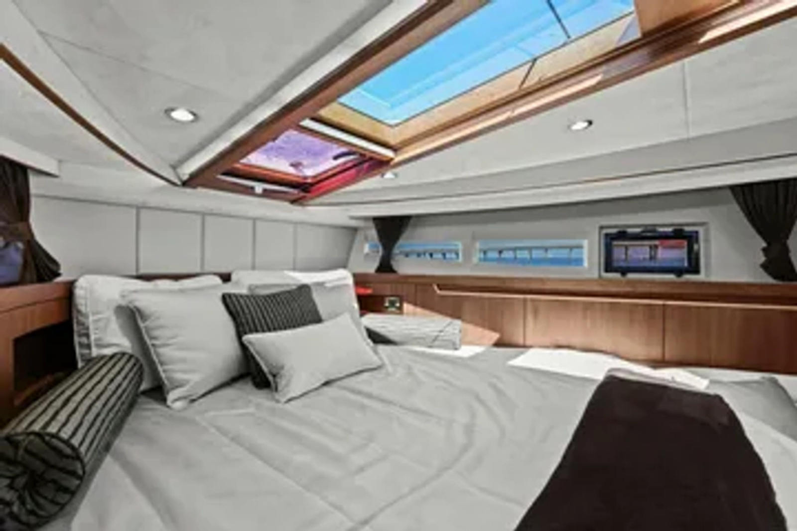 - 2 cabins, 2 heads with ample headroom and elegant woodwork, generous natural light from skylights and hull windows