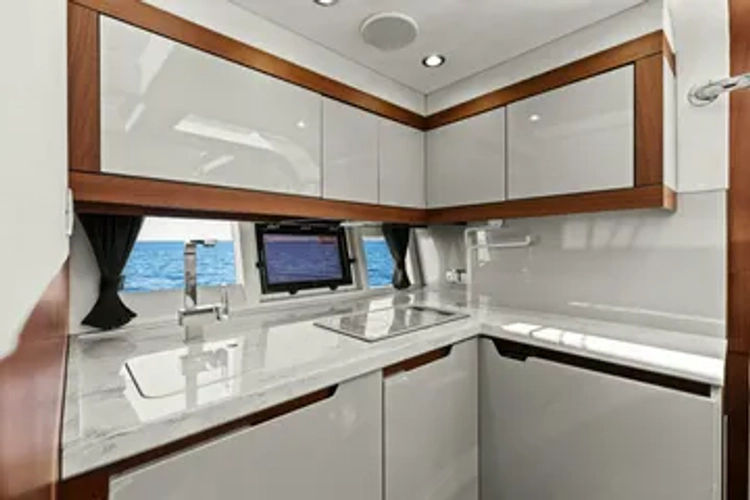The 385 HTS is quite literally maxed out with amazing use of space and the depth of consideration in adding luxury grace notes at every turn. The Alcantara suede lining the inside of closets, the backlit vanity elegantly squeezed into a bulkhead in the master stateroom, the artful inlay of the lowerdeck salon dining table.