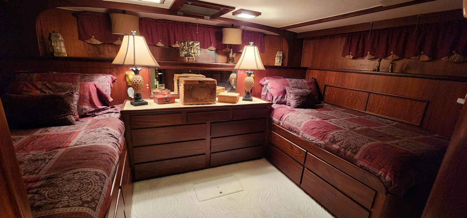 The main salon blends classic styling with functional helm access: