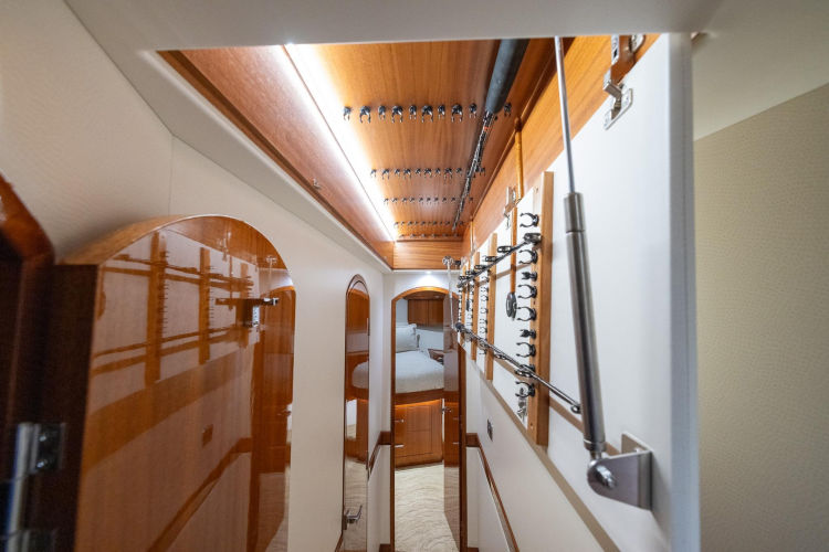 Aft in this hallway and down 4 steps to port, you come into the crew’s quarters. This area features two bunk rooms each with their own TV and entertainment as well as plenty of storage. The is another stateroom to starboard. They share a centerline head with shower and sink. There is engine room access from this area allowing the crew to access their cabins from the cockpit.